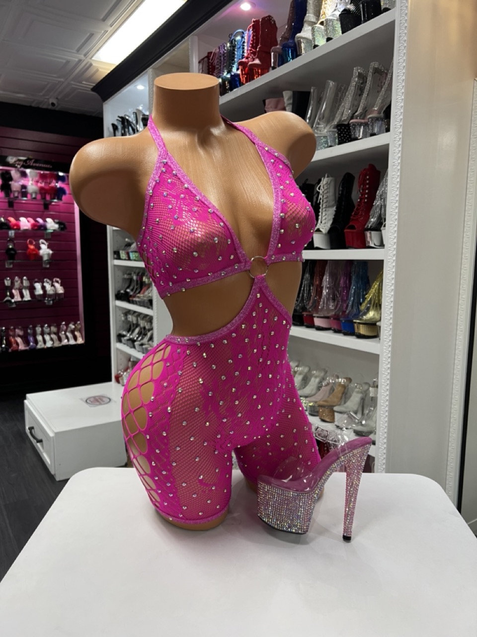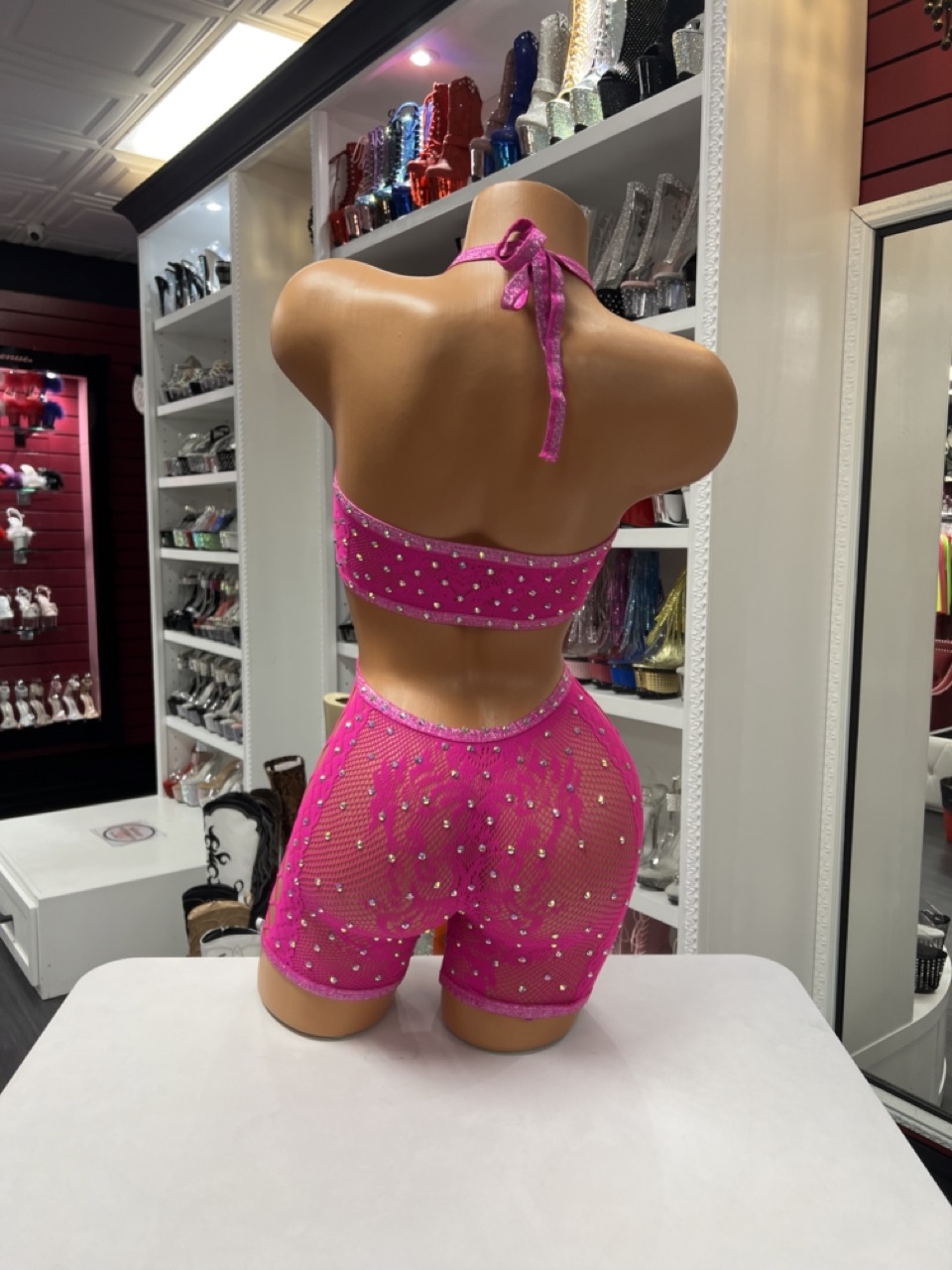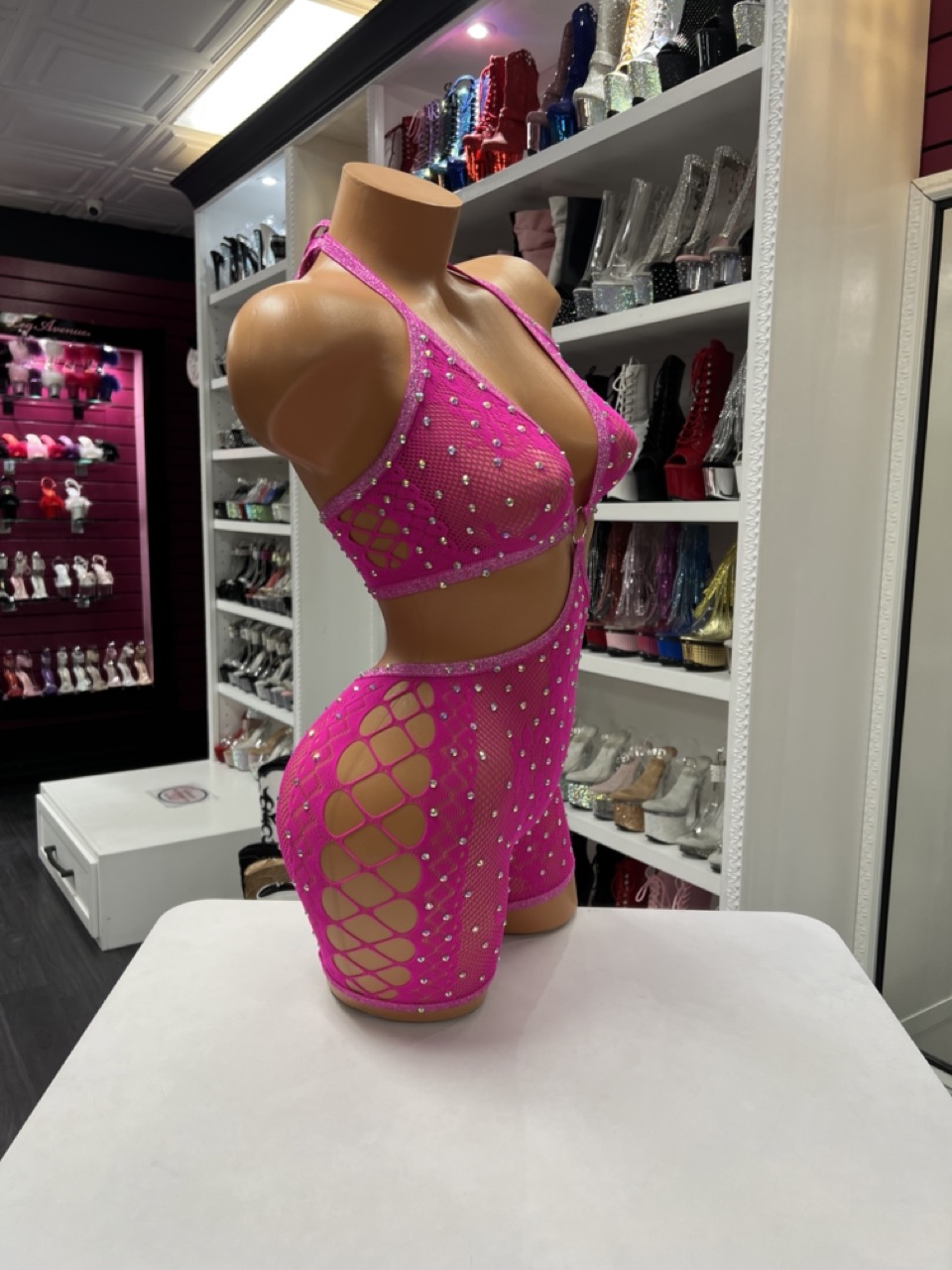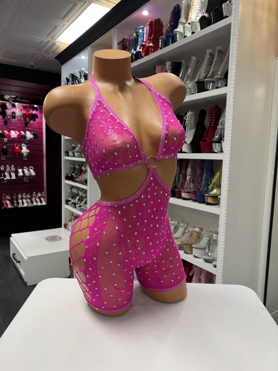 Hot pink fishnet romper with rhinestones and shredded side shorts