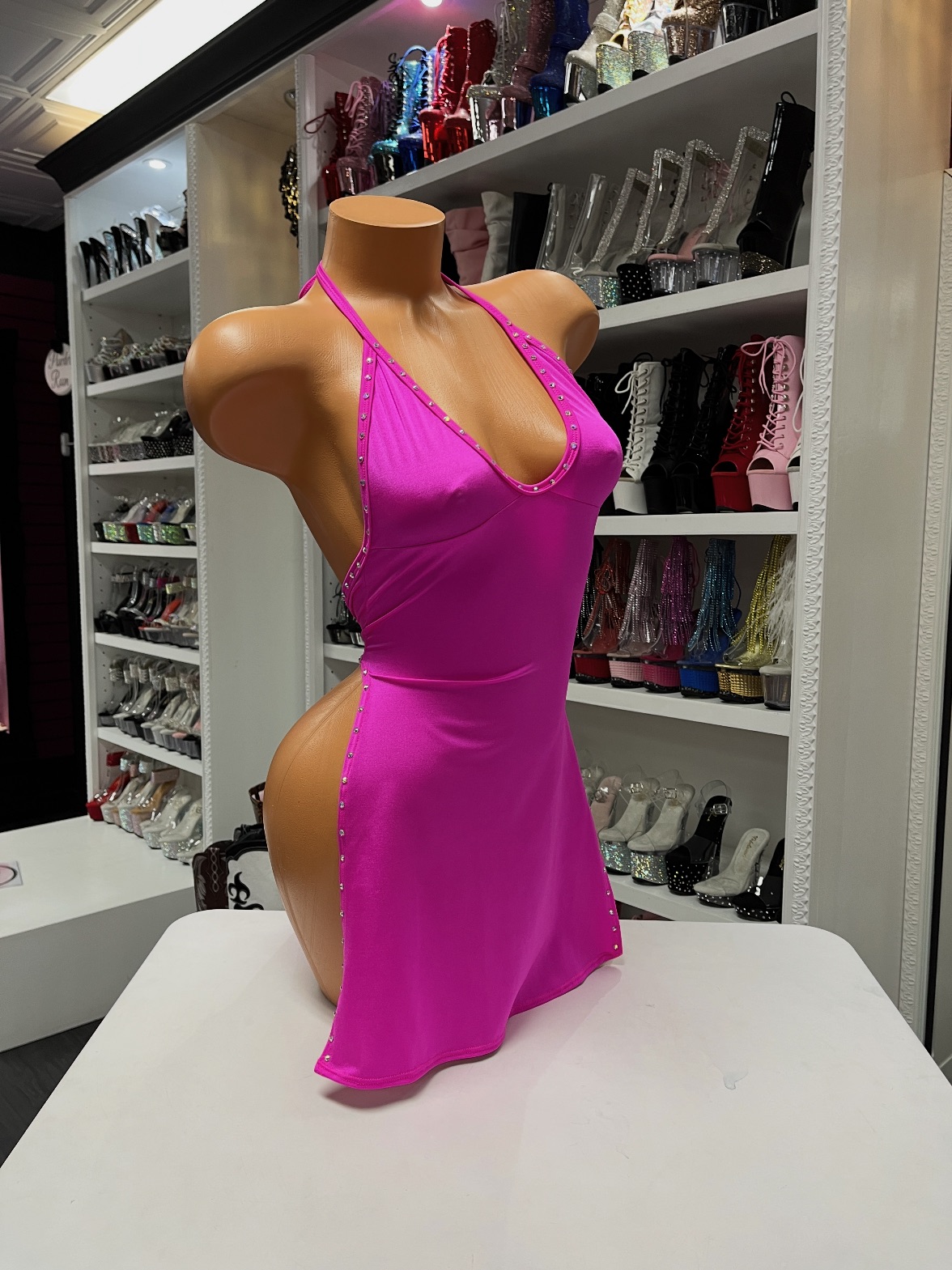 A hot pink halter dress with a sleek fit and bold color. Perfect for performers who want a confident and standout look.