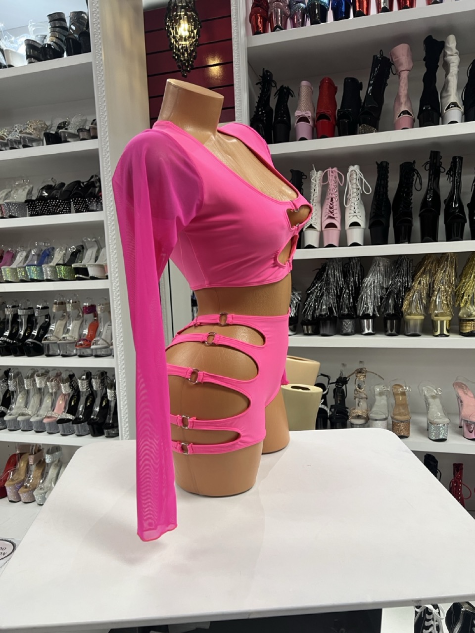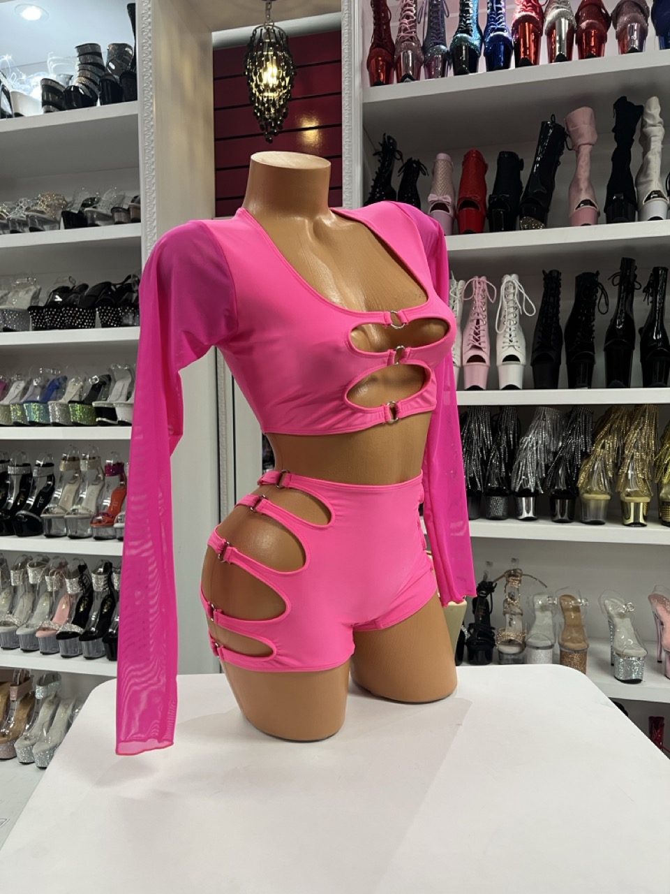 Pink long sleeve set featuring sculpted cutouts, high-waisted shorts, and bold hardware detailing. Perfect performer outfit for stage and nightlife wear.