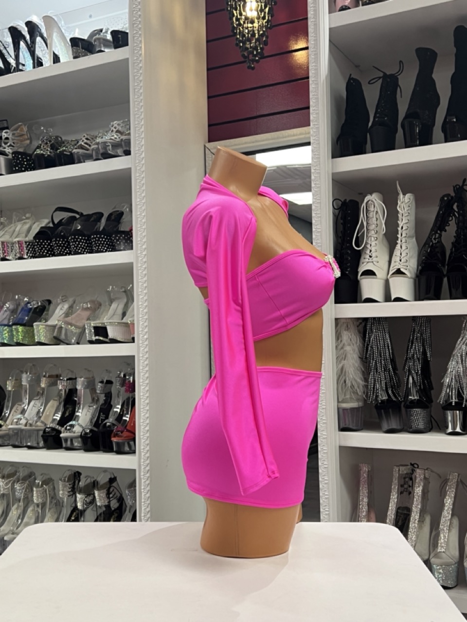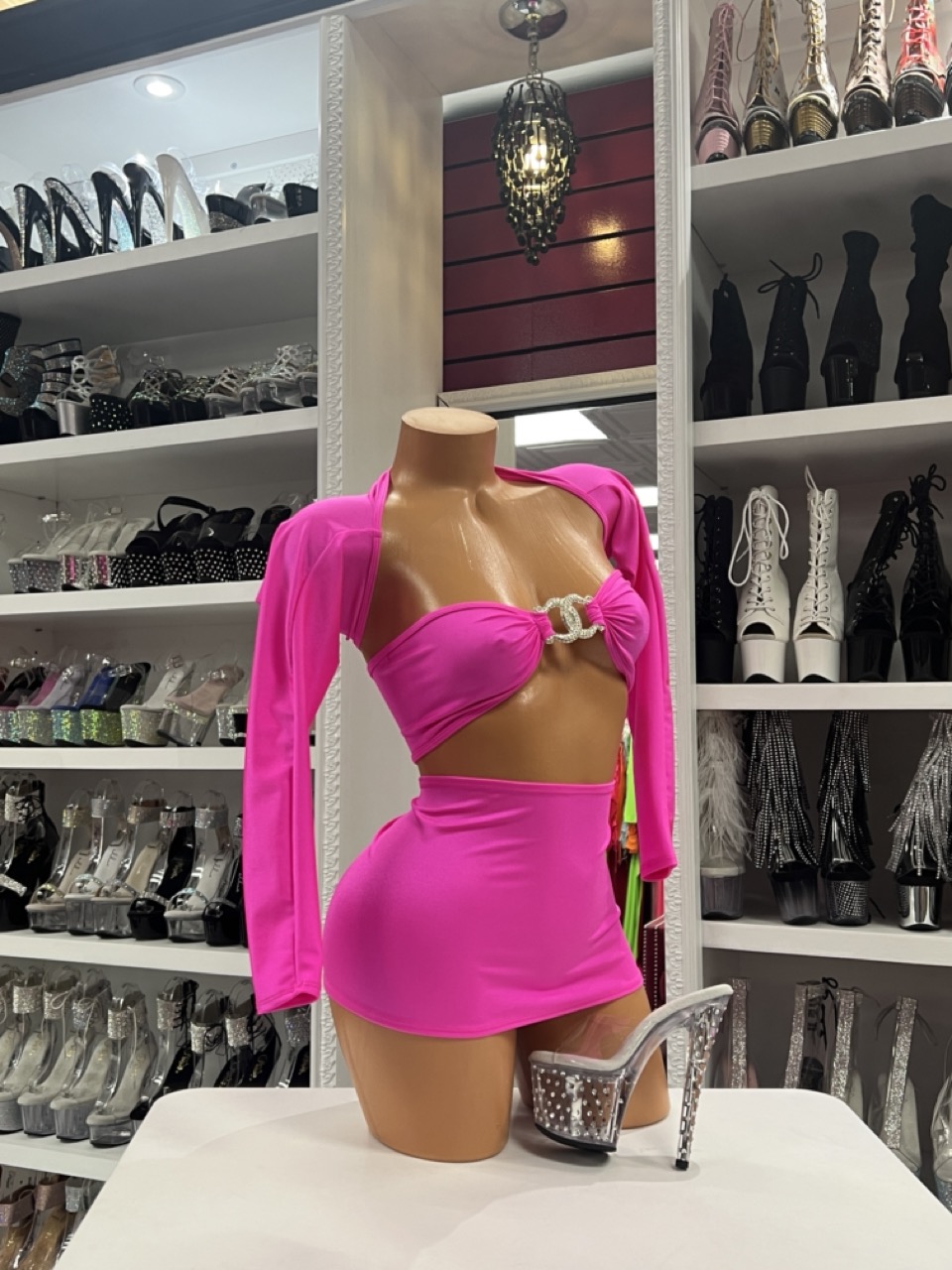 A bold hot pink three-piece mini set with a rhinestone bandeau top, bolero shrug, and smooth stretch skirt. Bright, sexy, and perfect for dancers.