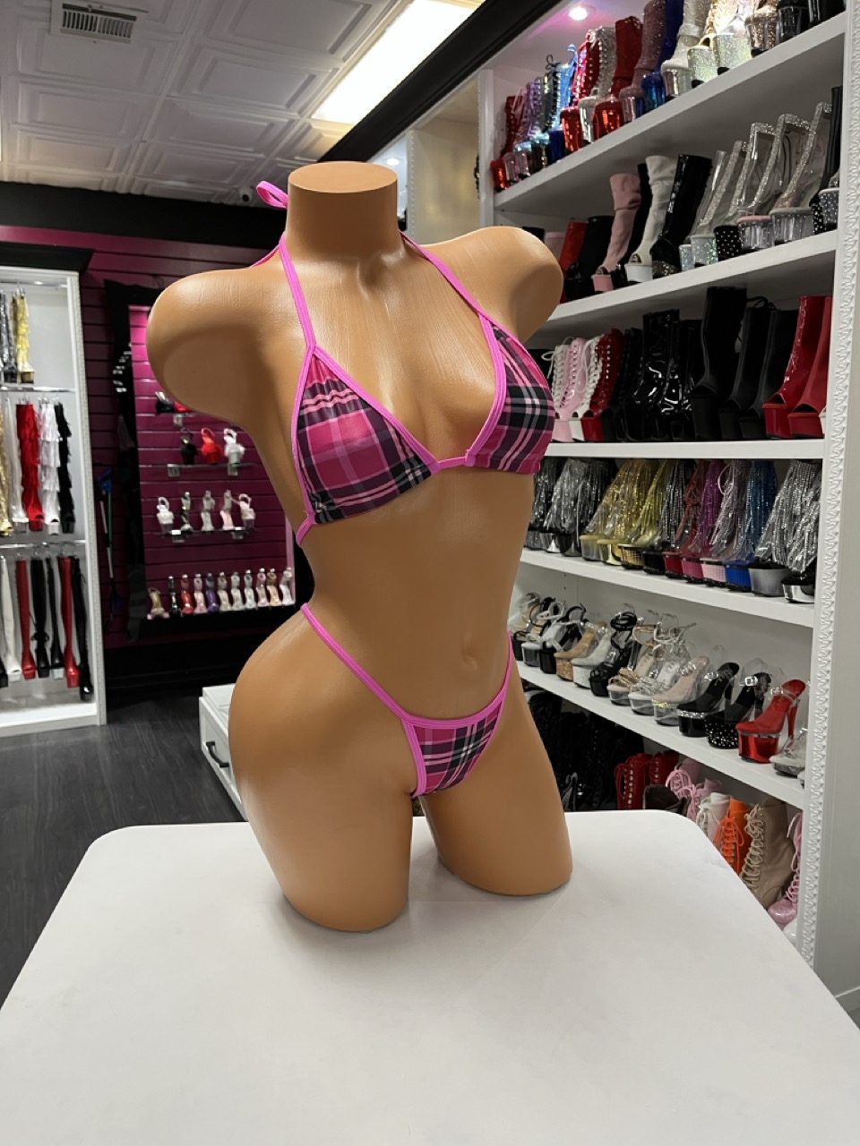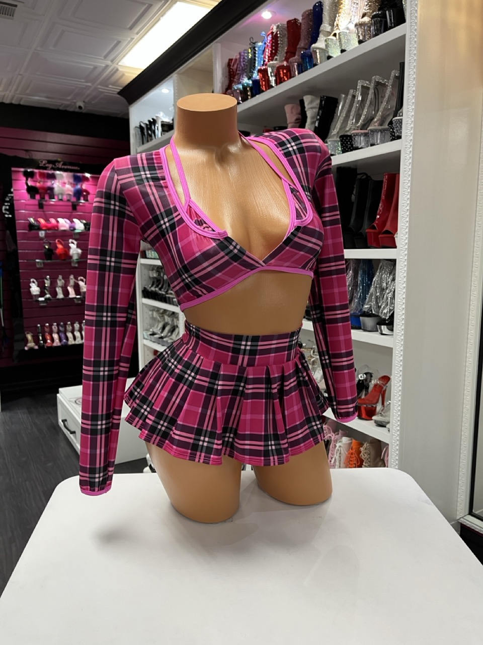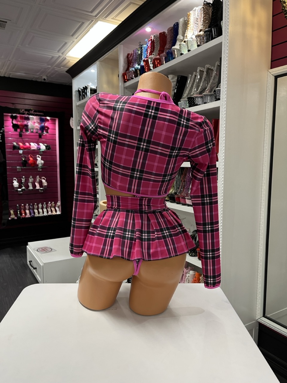 A flirty 4 piece outfit featuring a long-sleeve crop top and matching bikini and mini skirt in bold hot pink plaid. Perfect for performers who want comfort, movement, and standout style.