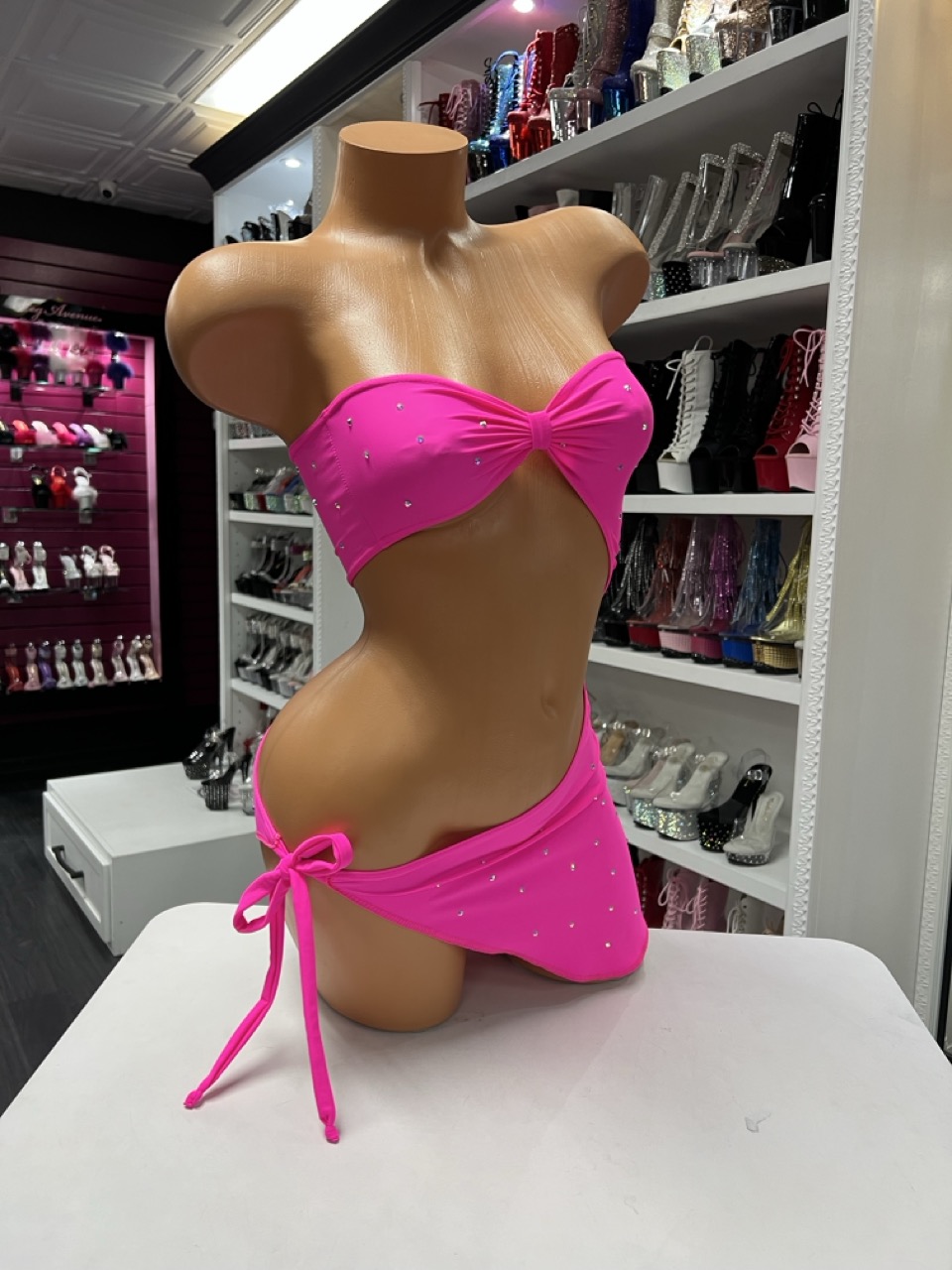 hot pink tie dress strapless bandeau mini dress adjustable side tie detail fitted silhouette bright color stretchy fabric