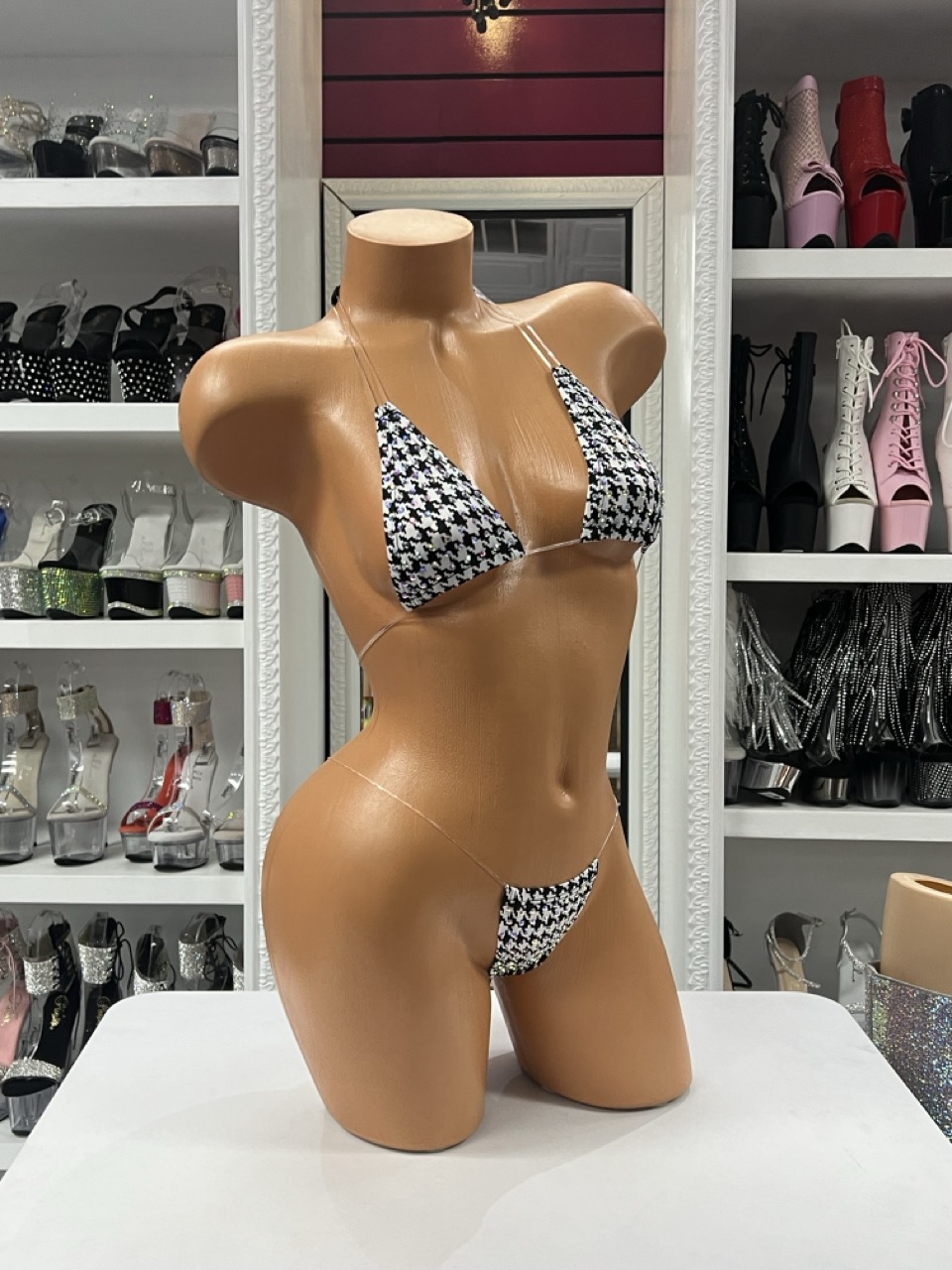 Black and white houndstooth micro bikini set with sleek clear straps. A bold minimalist stage look for performers.
