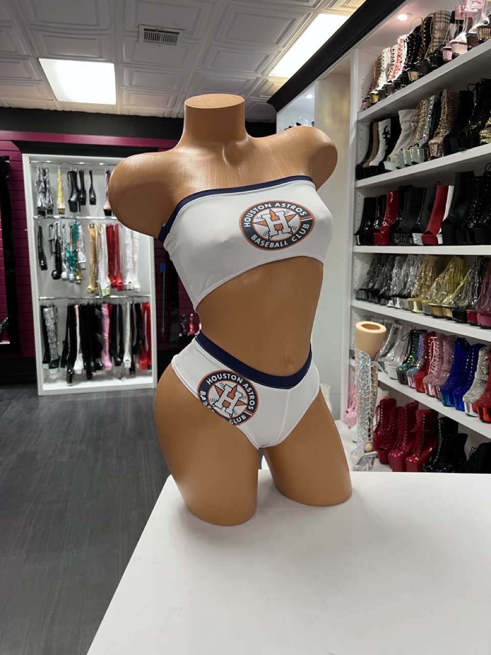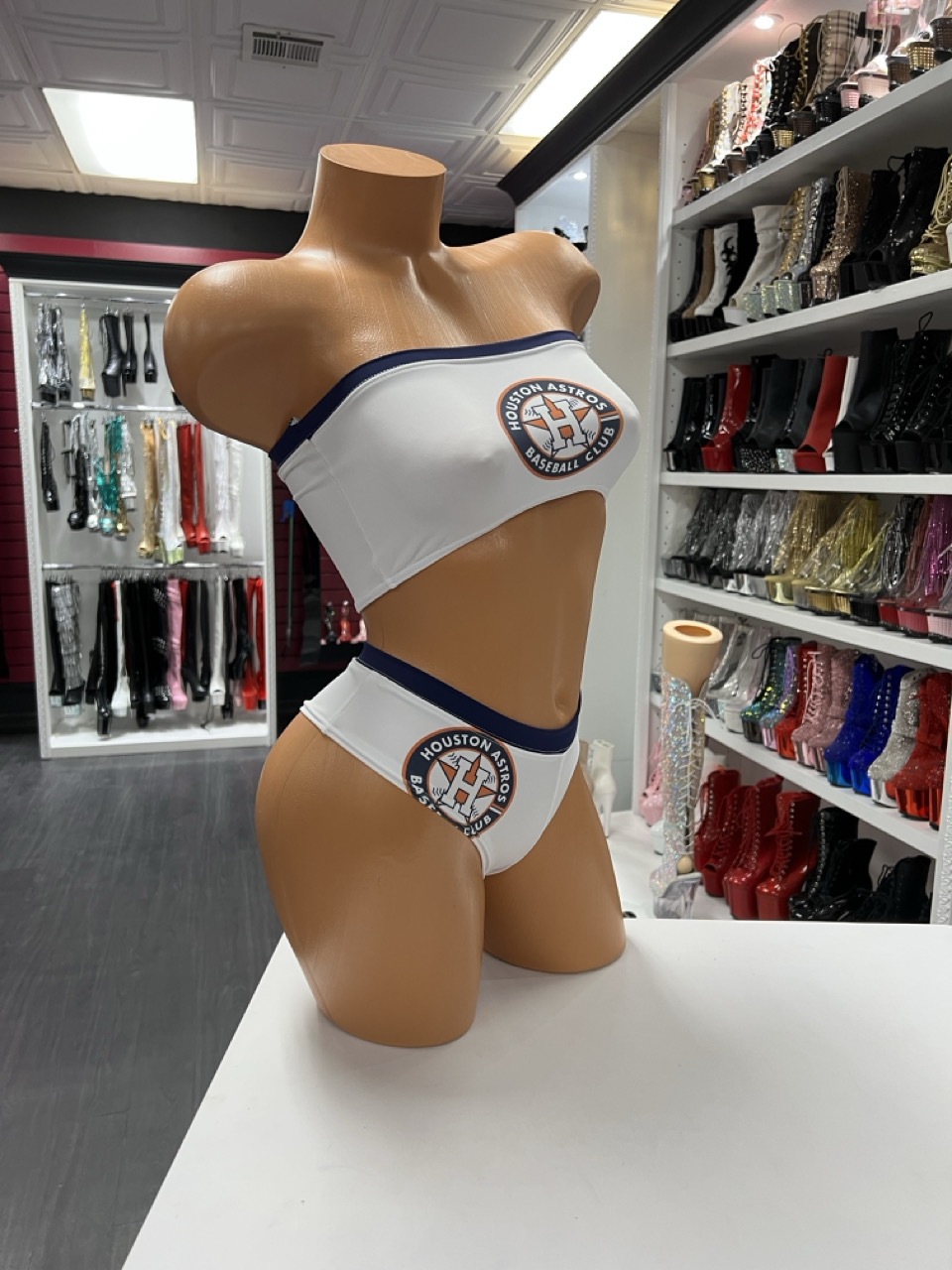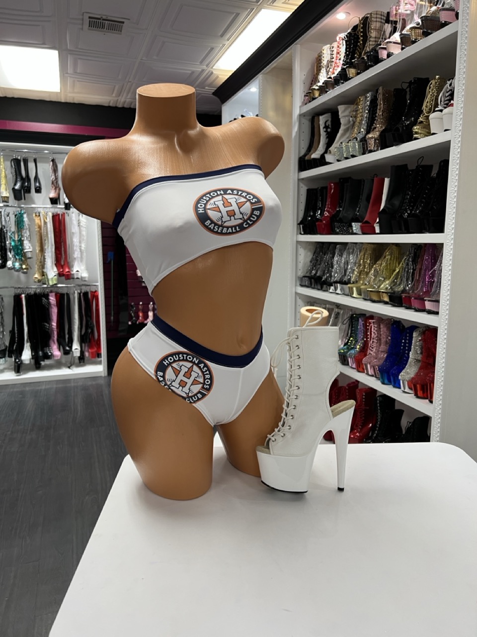 Houston baseball-themed white bikini set on mannequin with white platform boot