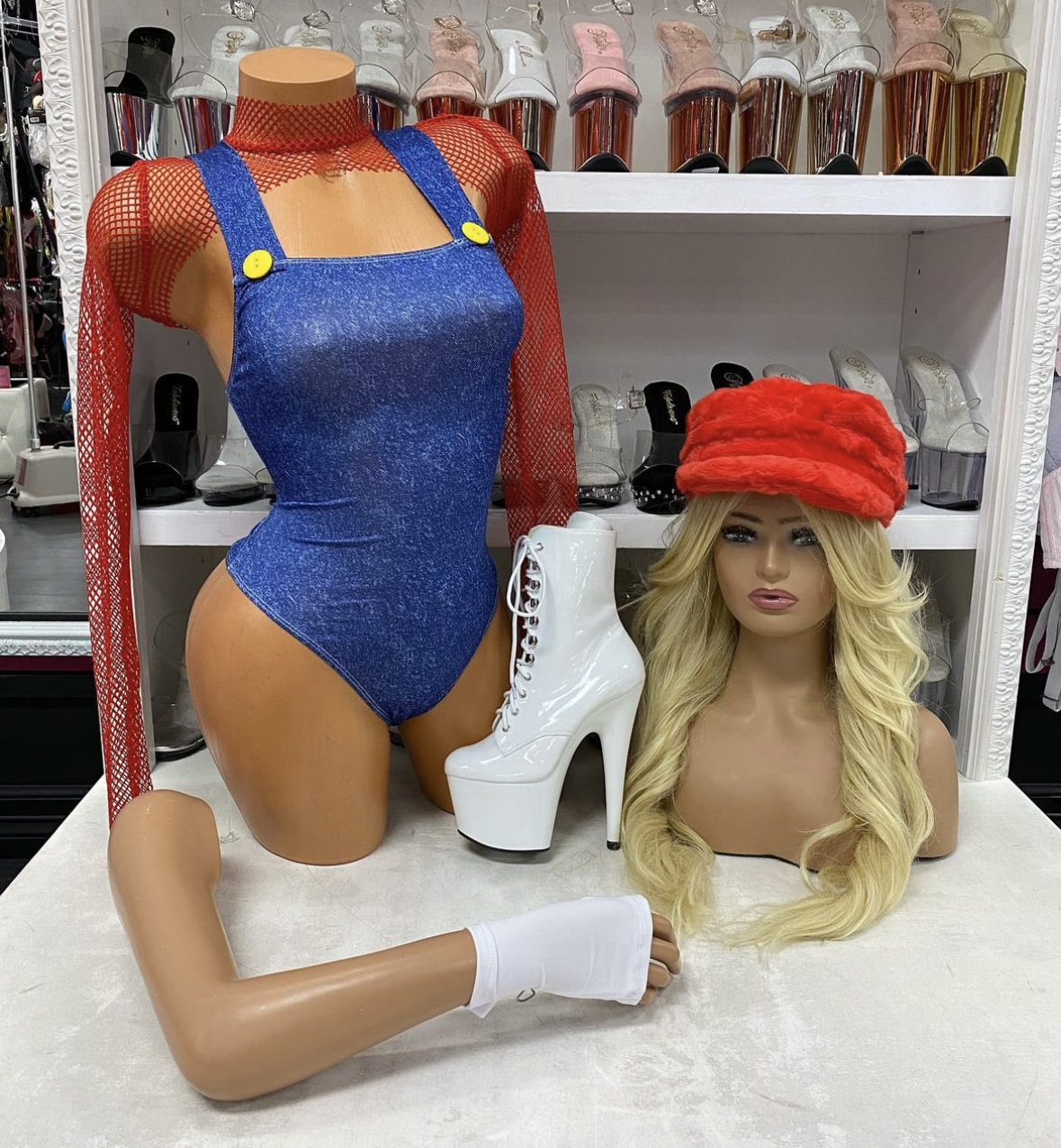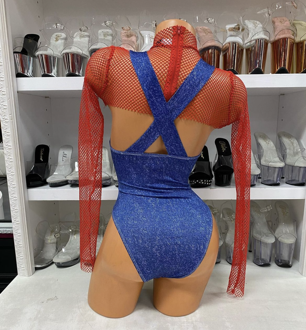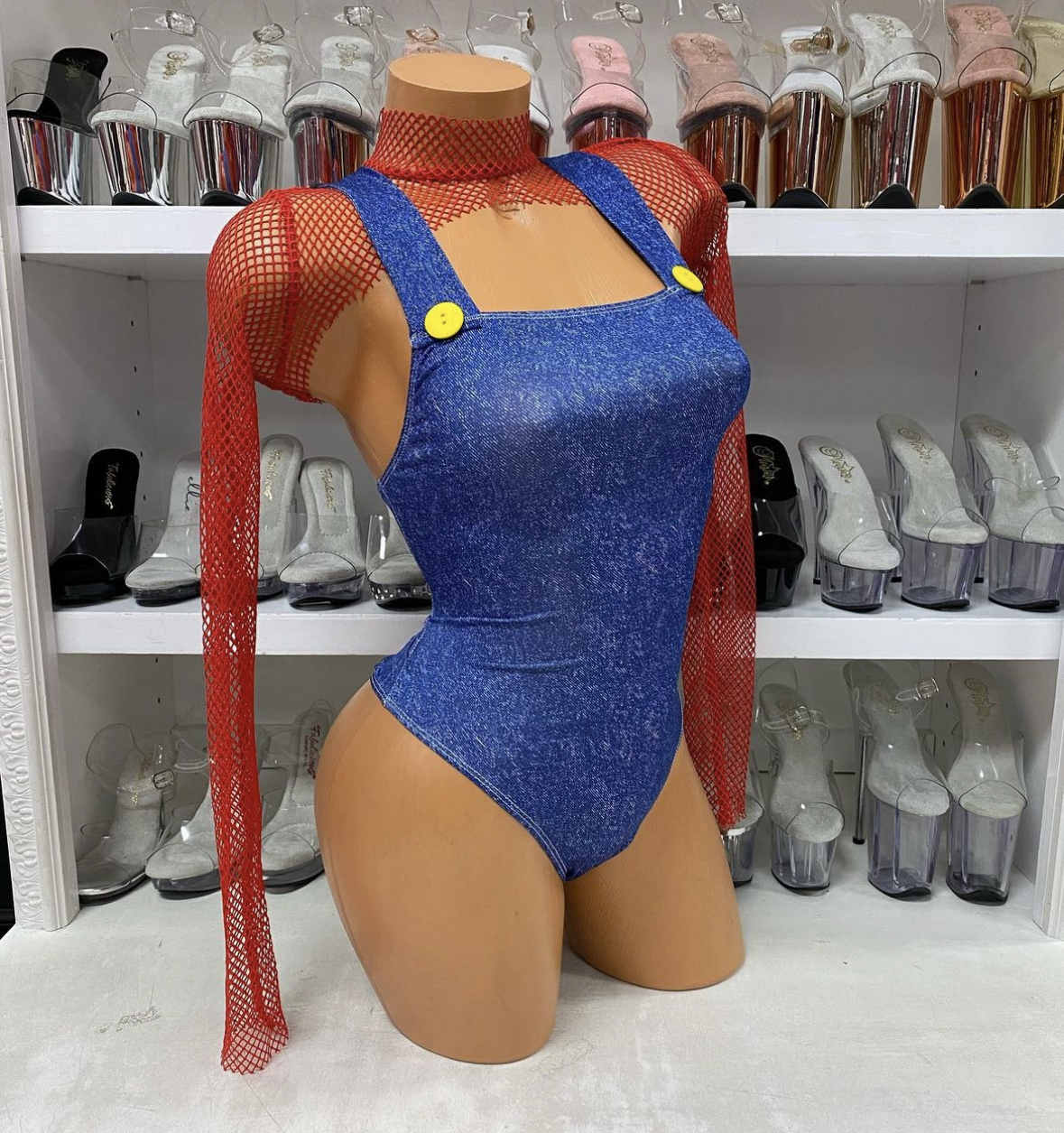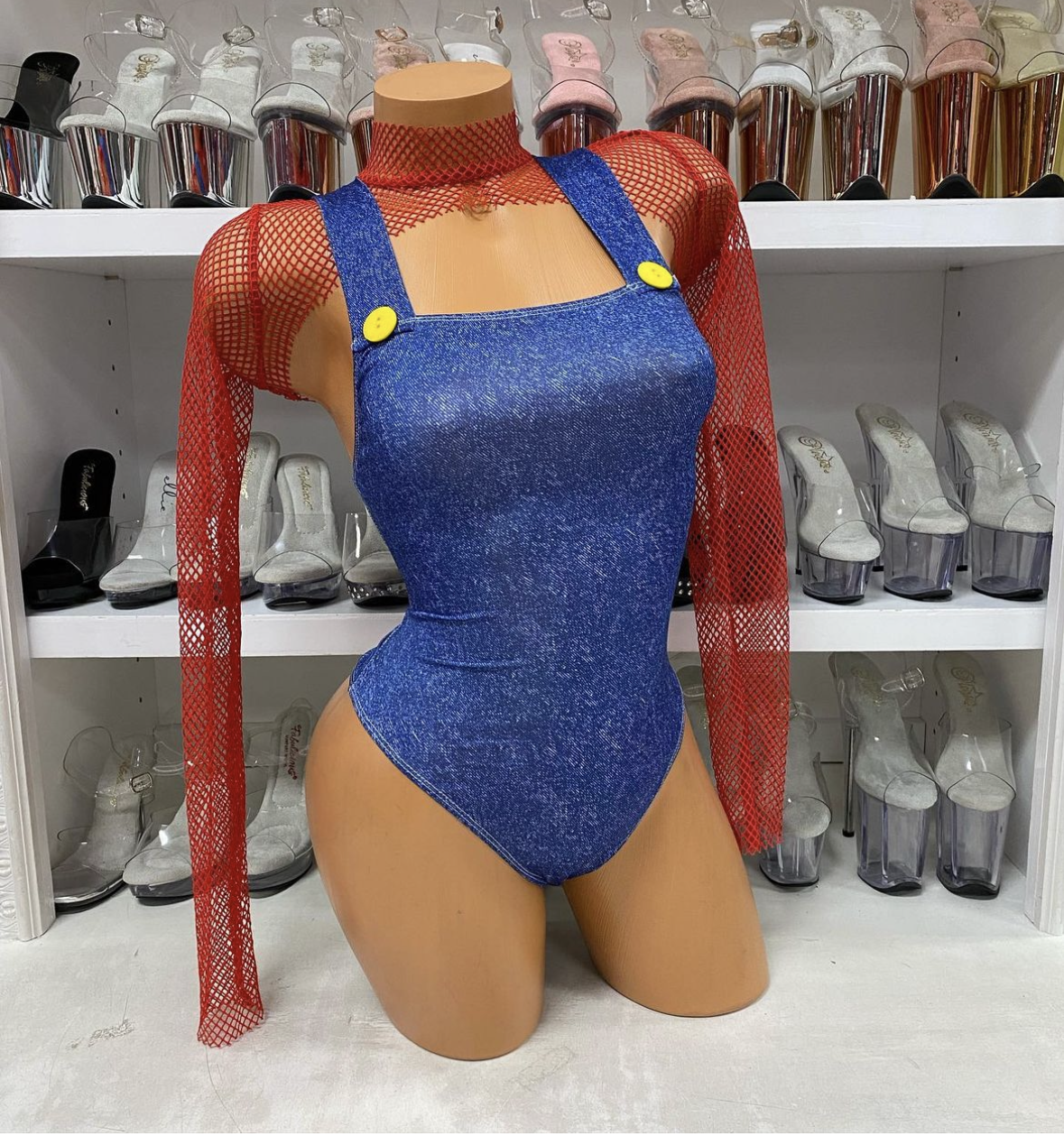 4-piece sexy comic book character features overalls style bodysuit with contrast accents paired with contrast fishnet mockneck bolero and fingerless gloves and faux fur hat and metal necklace. No returns or exchanges.