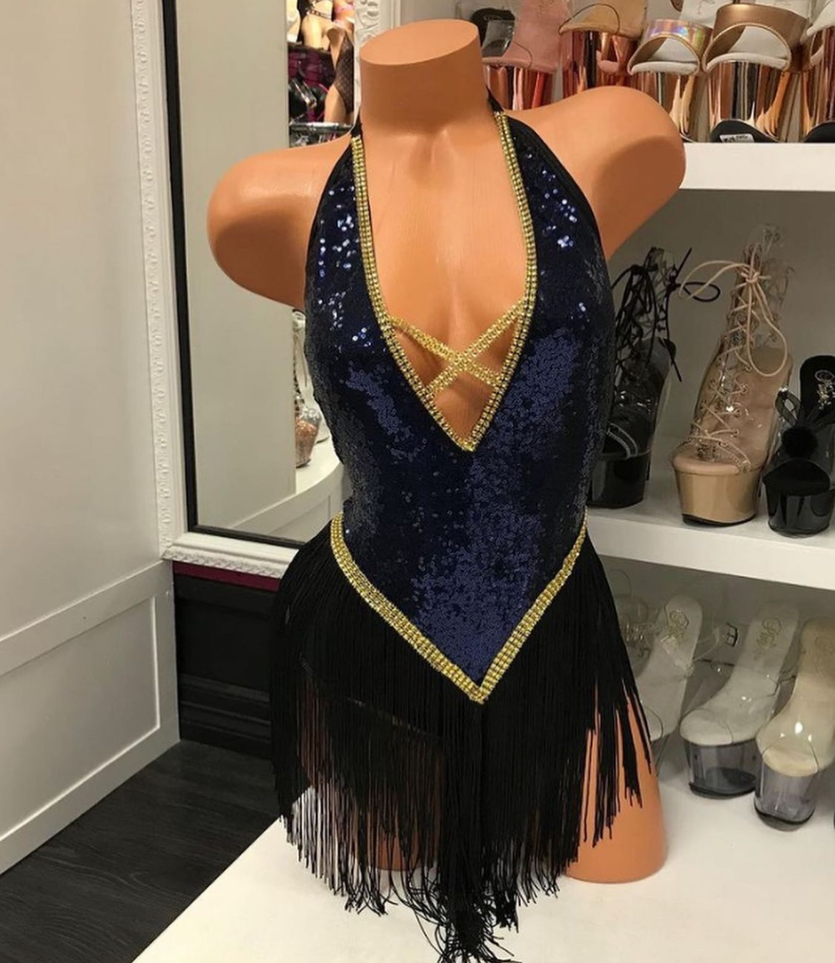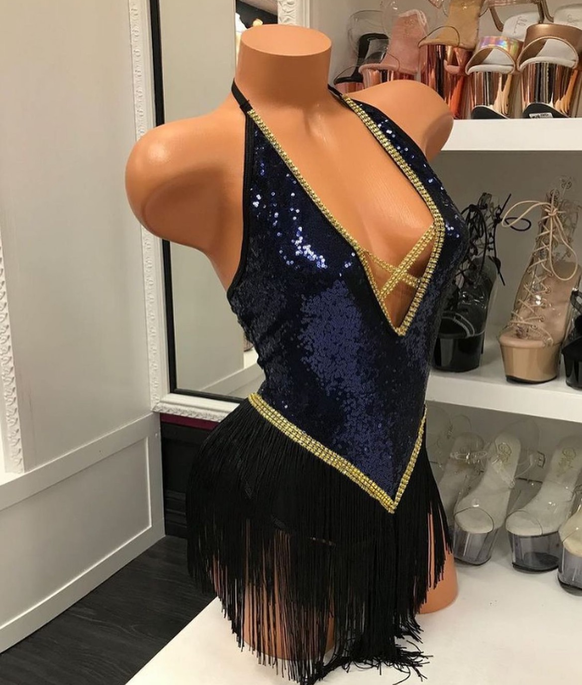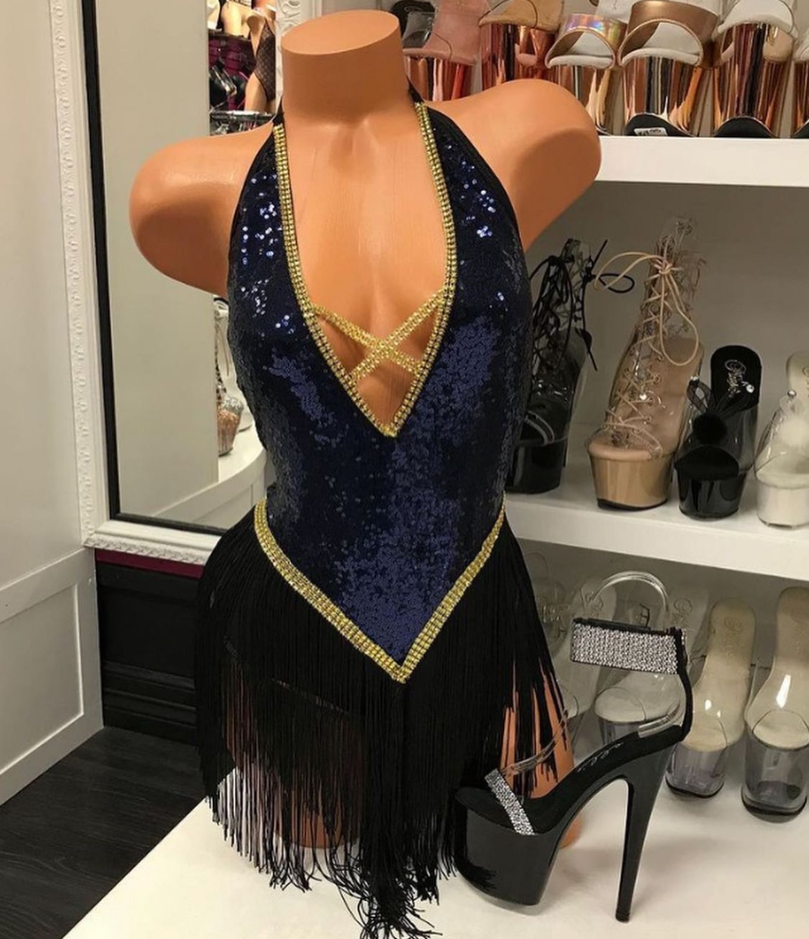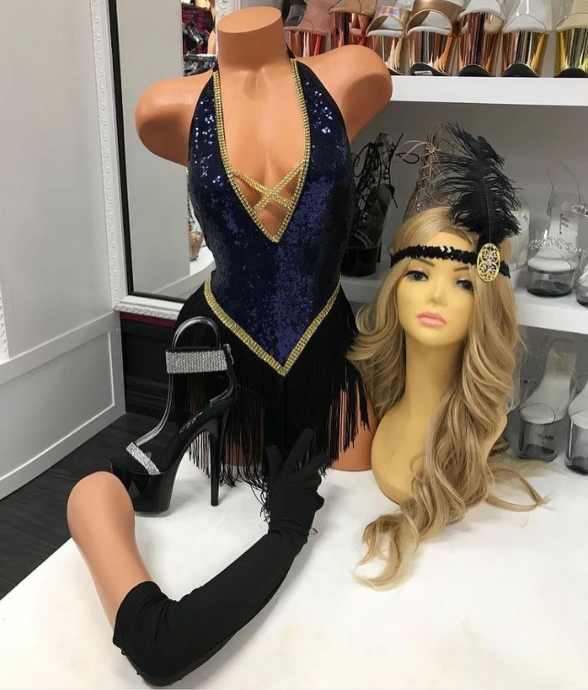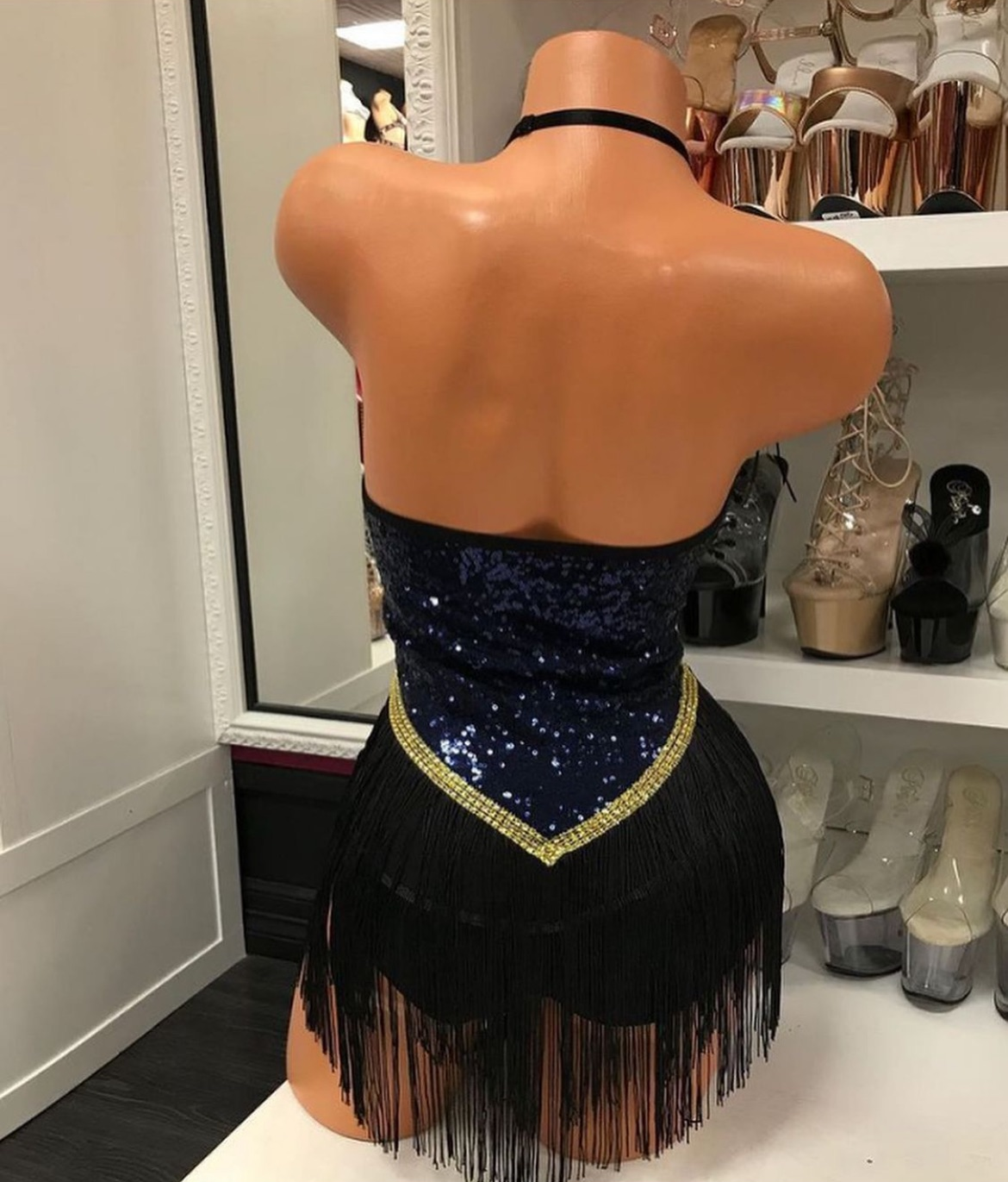 Navy blue sequin jazzy jezebel flapper costume with black fringe skirt and gold accents