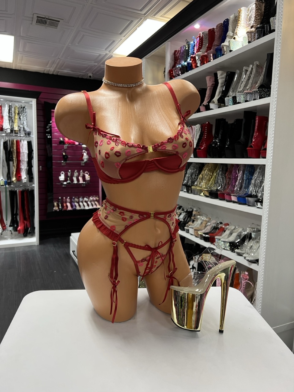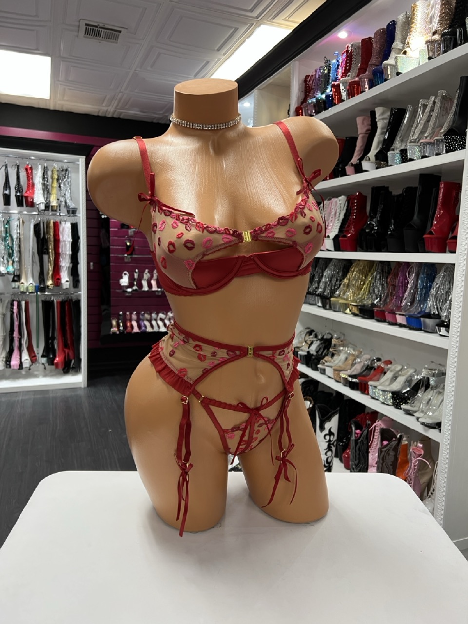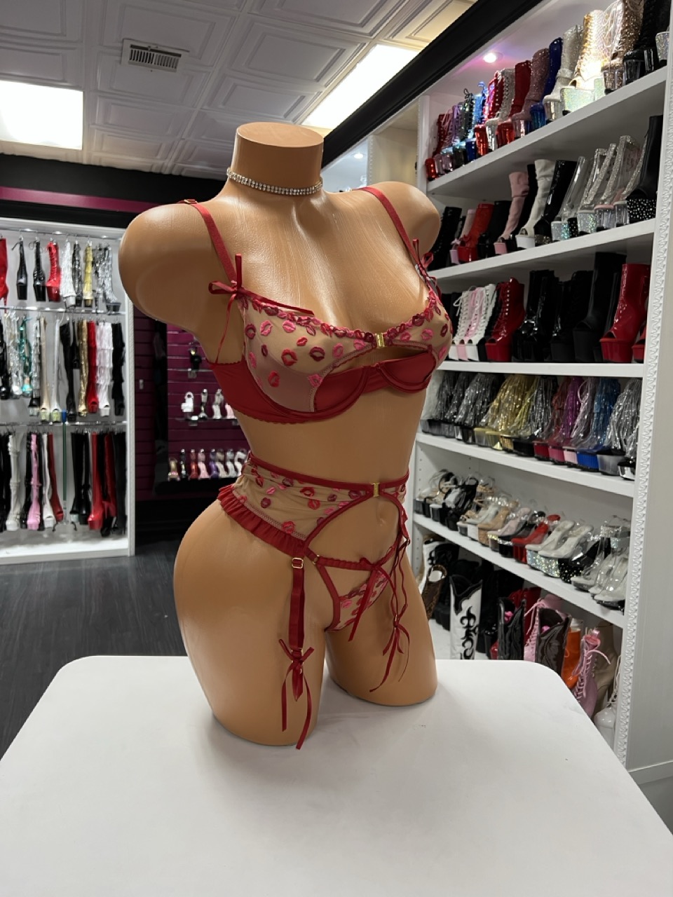 Kiss print three piece lingerie set with bra garter belt and thong displayed on mannequin
