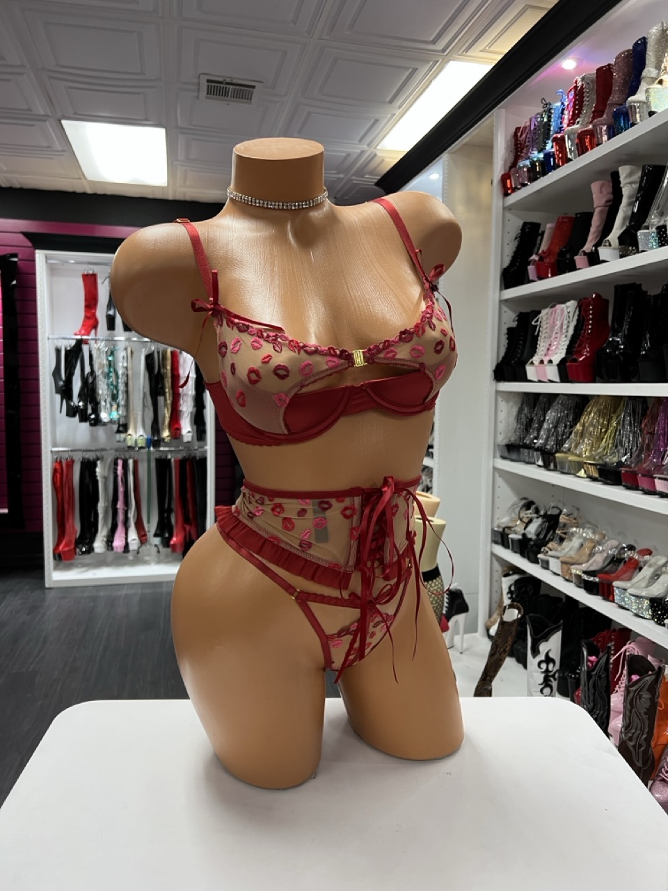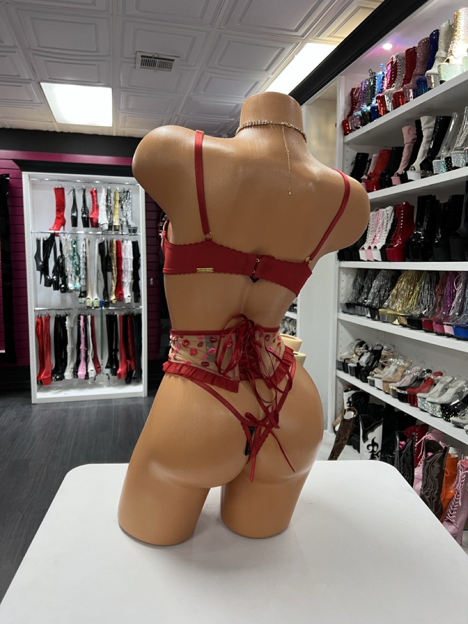 A flirty three piece lingerie set with kiss-print mesh, underwire bra, garter belt, and thong. Playful, flattering, and stage-ready.