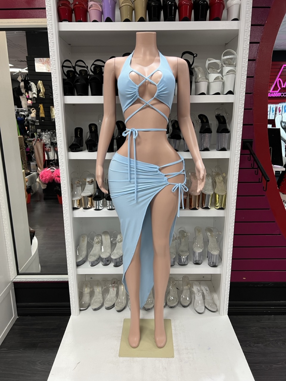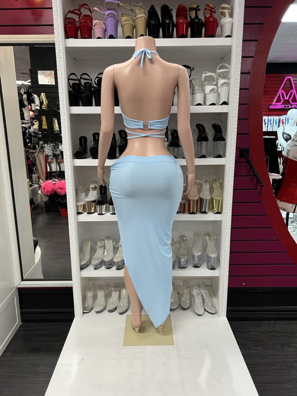 Light blue two-piece wrap set with crisscross halter top and high-slit skirt. Stretchy, lightweight, and perfect for confident stage movement.