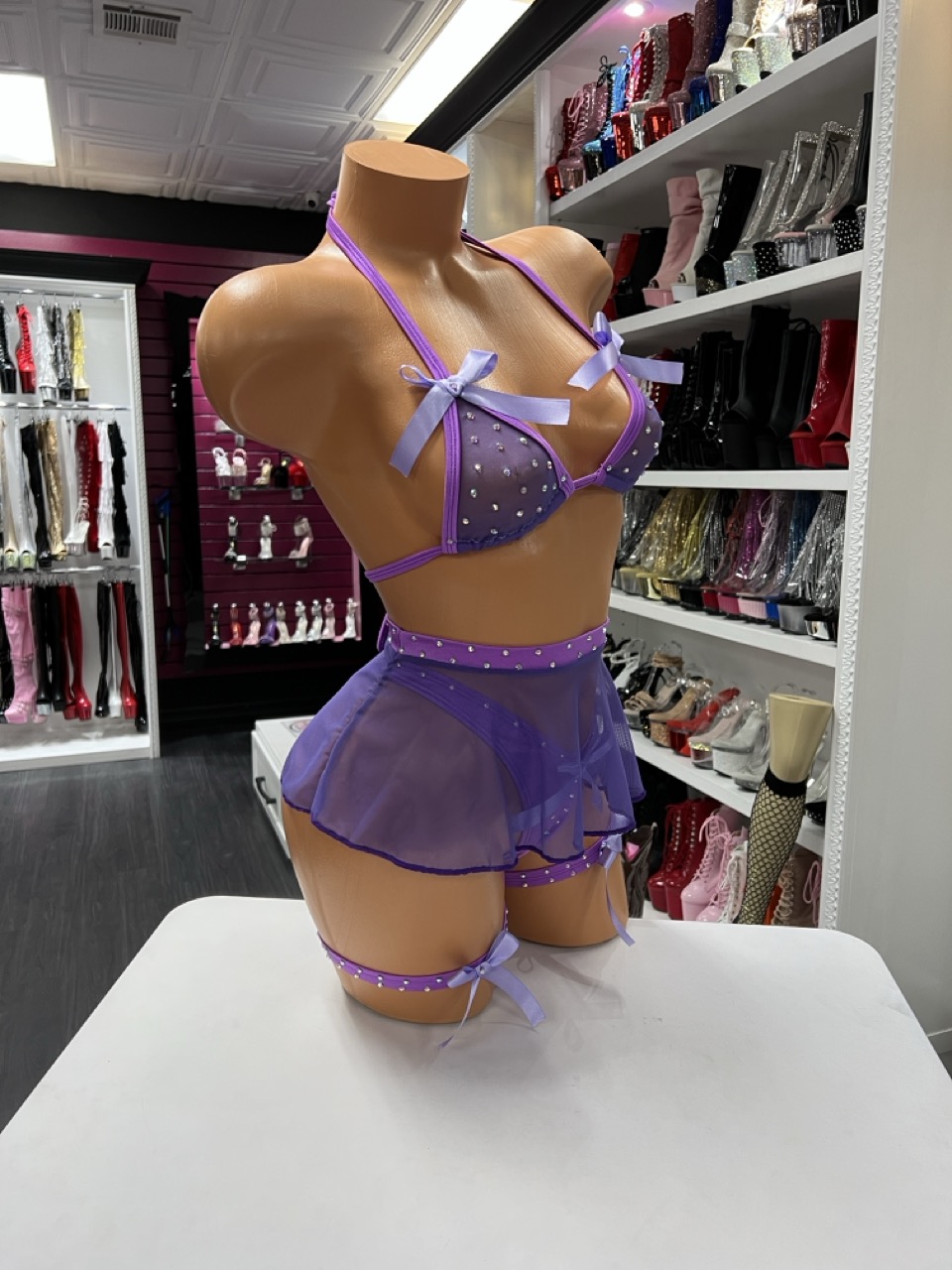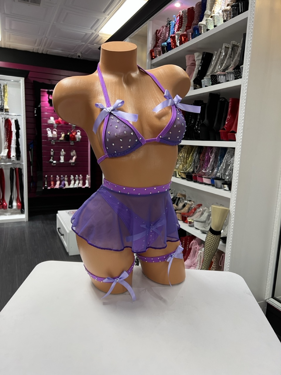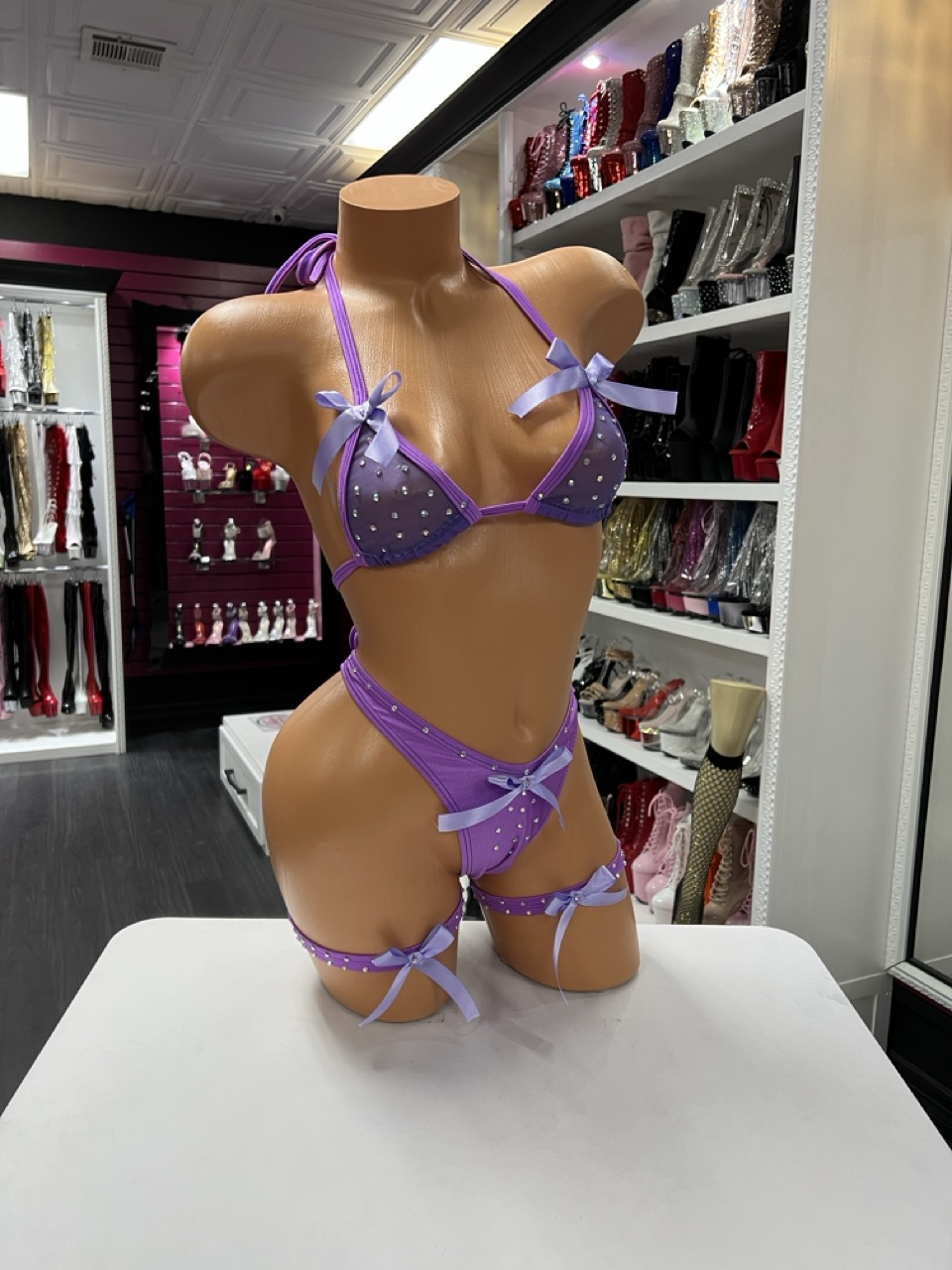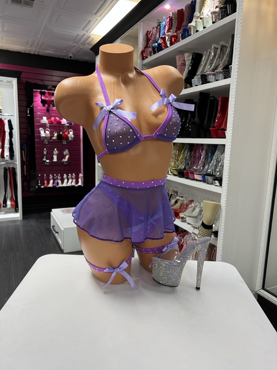 Lavender crystal bow performance set with halter bra, sheer skirt, and garter straps on mannequin