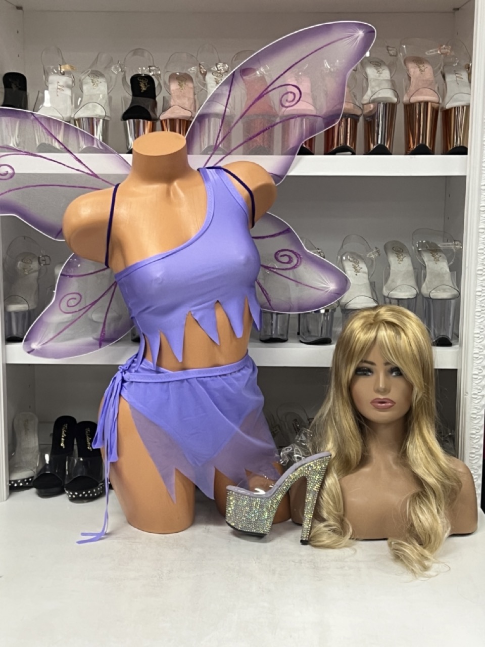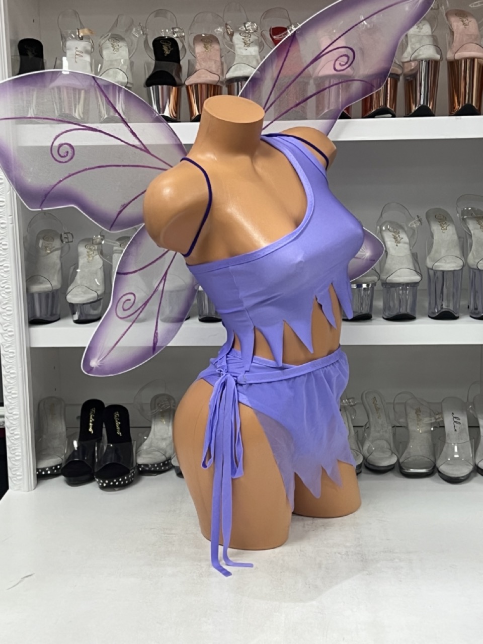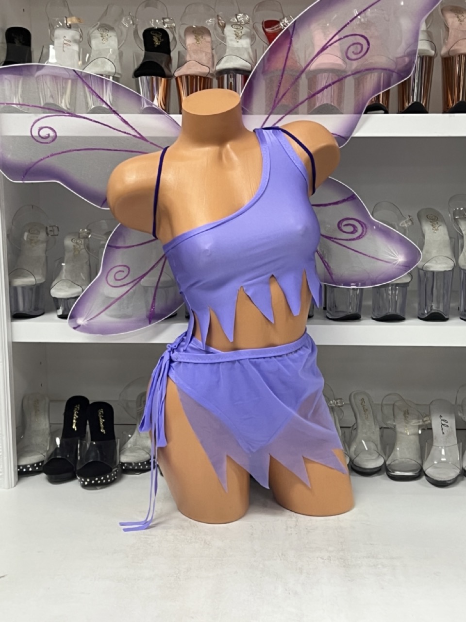 Lavender Dreams Mesh Set in sheer lavender mesh with jagged hem and tie skirt. Fairy wings sold separately.