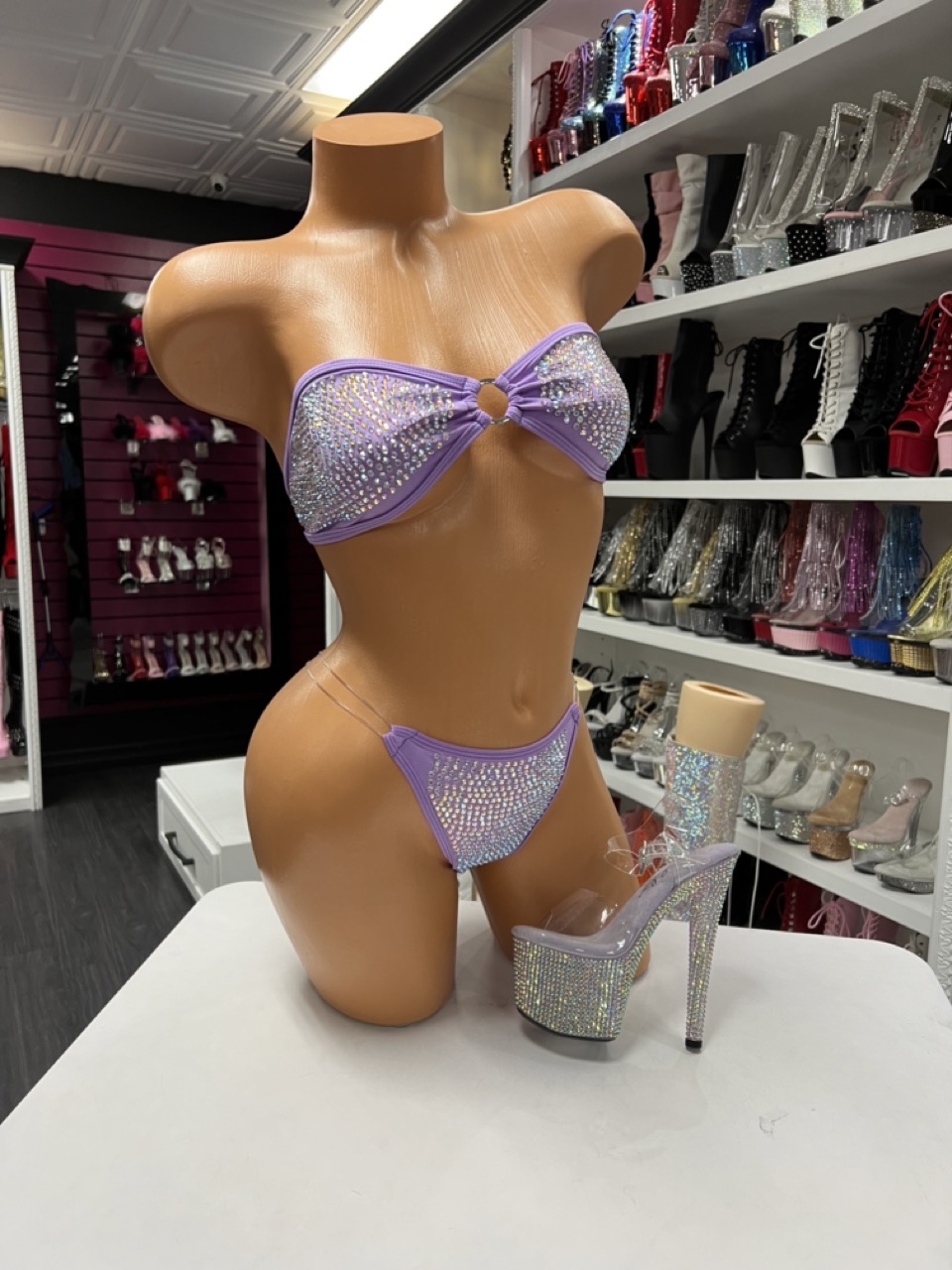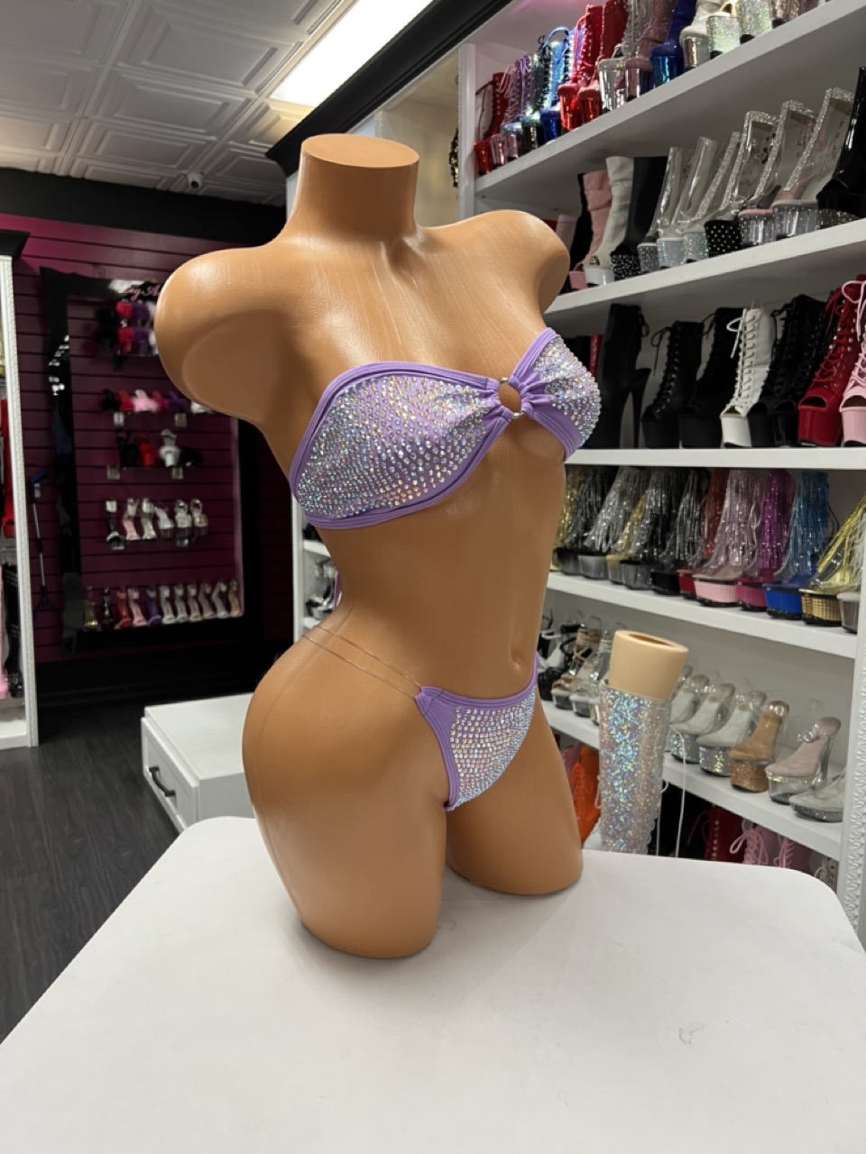 A lavender rhinestone bikini set with a ring detail top and high-cut bottoms. Soft, sparkly, and made to shine.