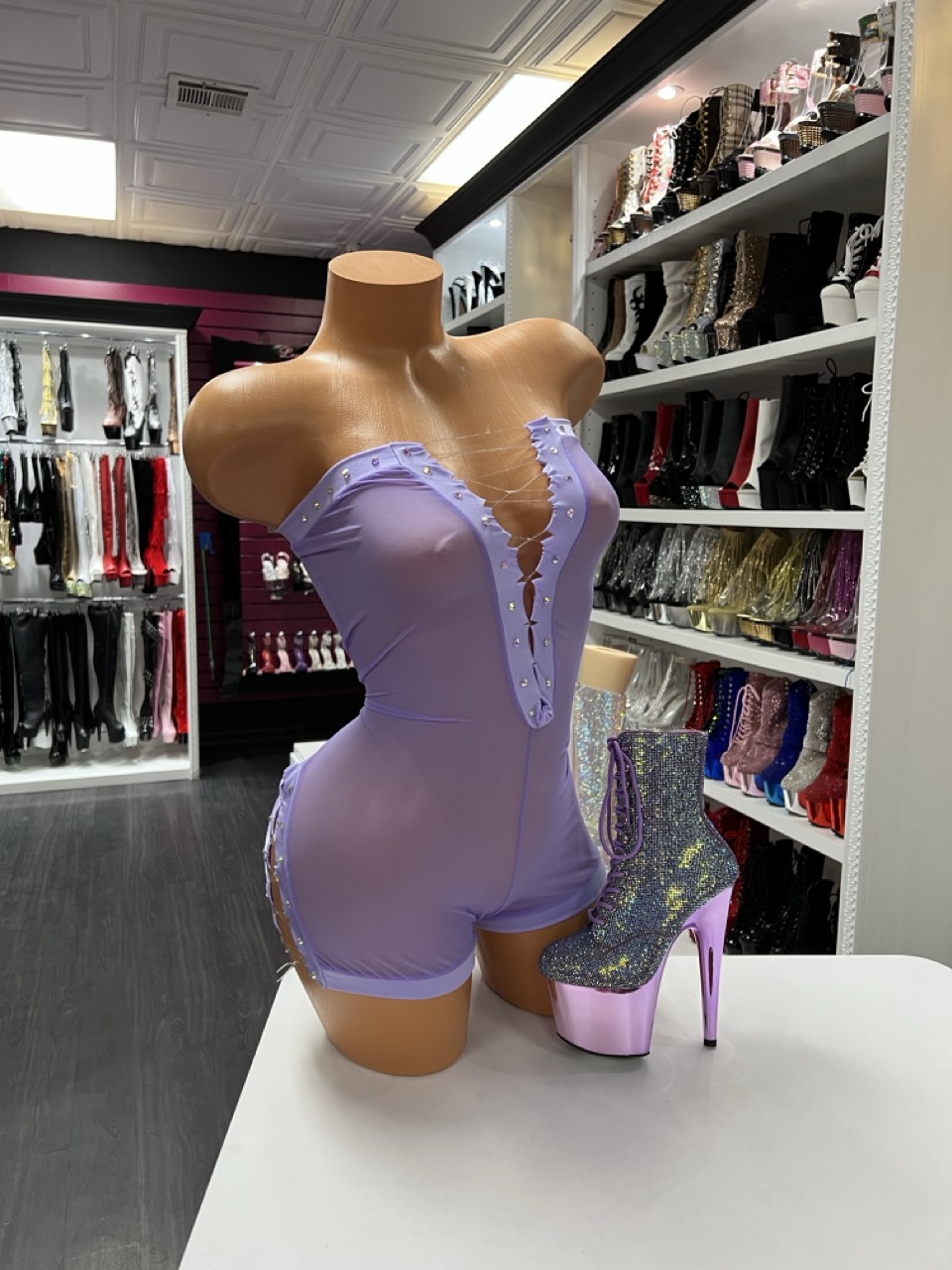 The Lavender Rhinestone Cutout Romper features a plunging lace-up neckline, rhinestone accents, and bold side cutouts, perfect for stagewear and nightlife.