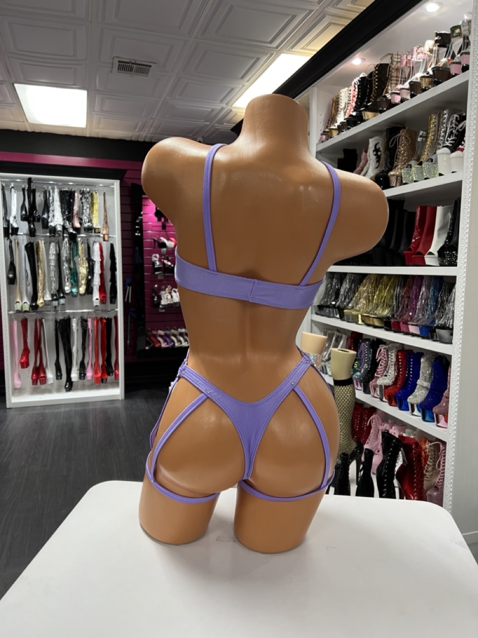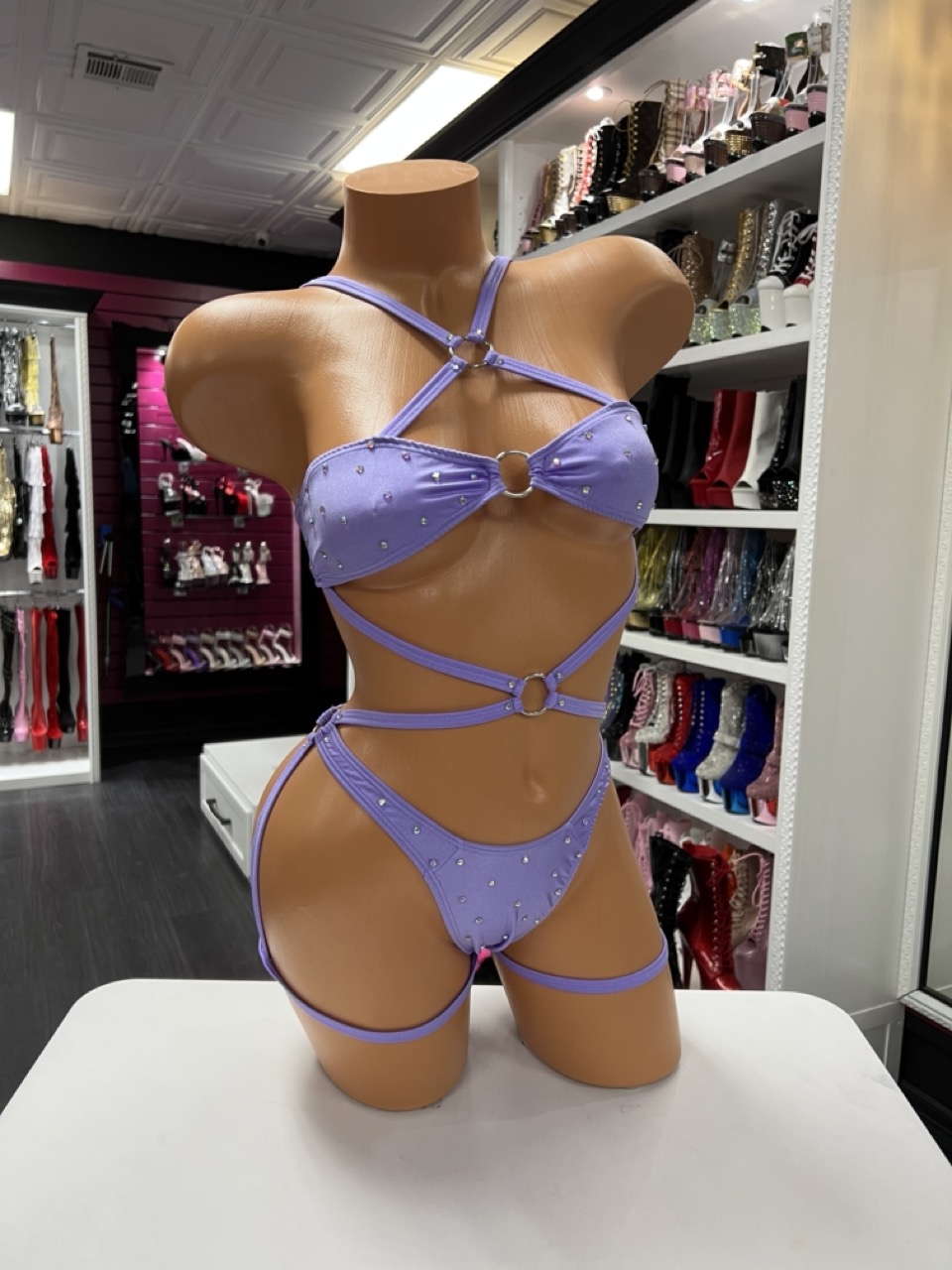 Strappy lavender two-piece set with rhinestone accents and harness detailing. Designed for confident movement and bold stage style.
