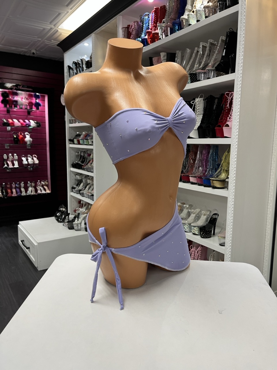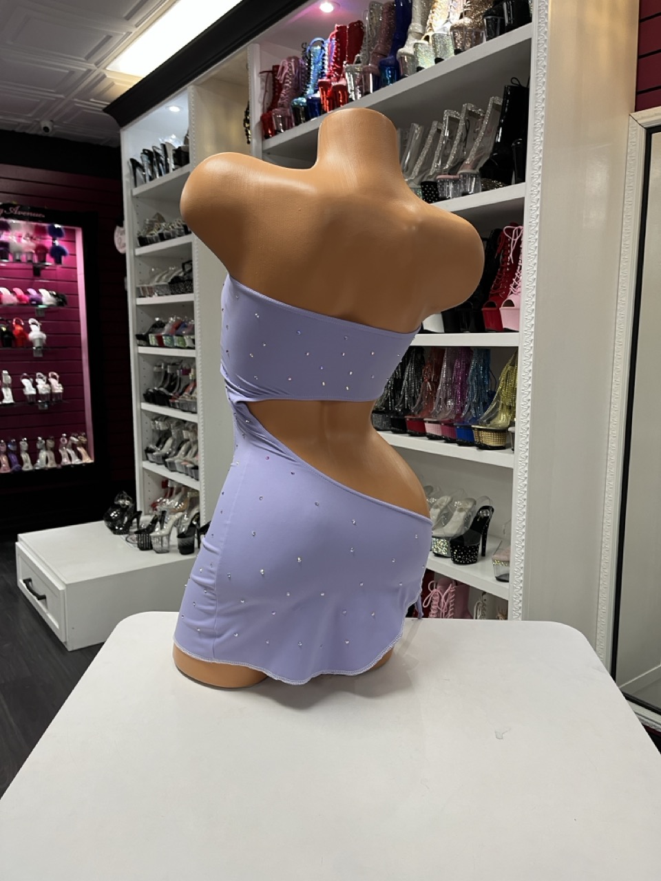 Lavender rhinestone skirt set with a bandeau top and side tie mini skirt. Soft, sleek, and designed to highlight your curves.