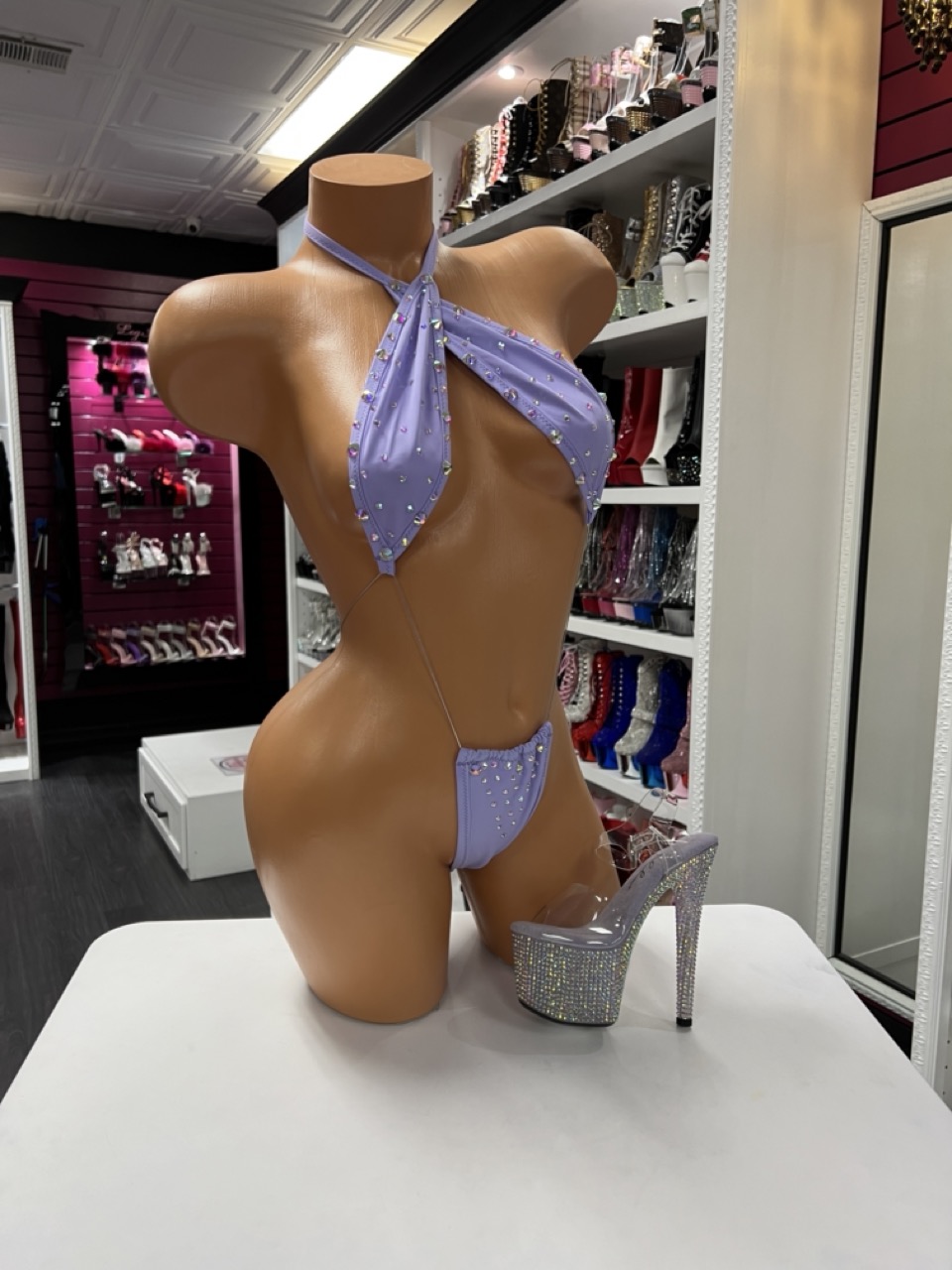 Lavender slingshot-style one-piece with rhinestone accents. Designed for bold movement, confidence, and standout stage presence.