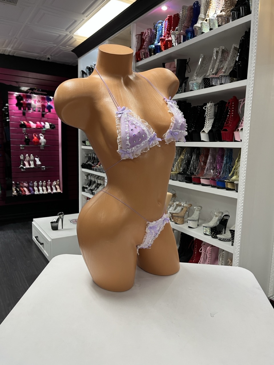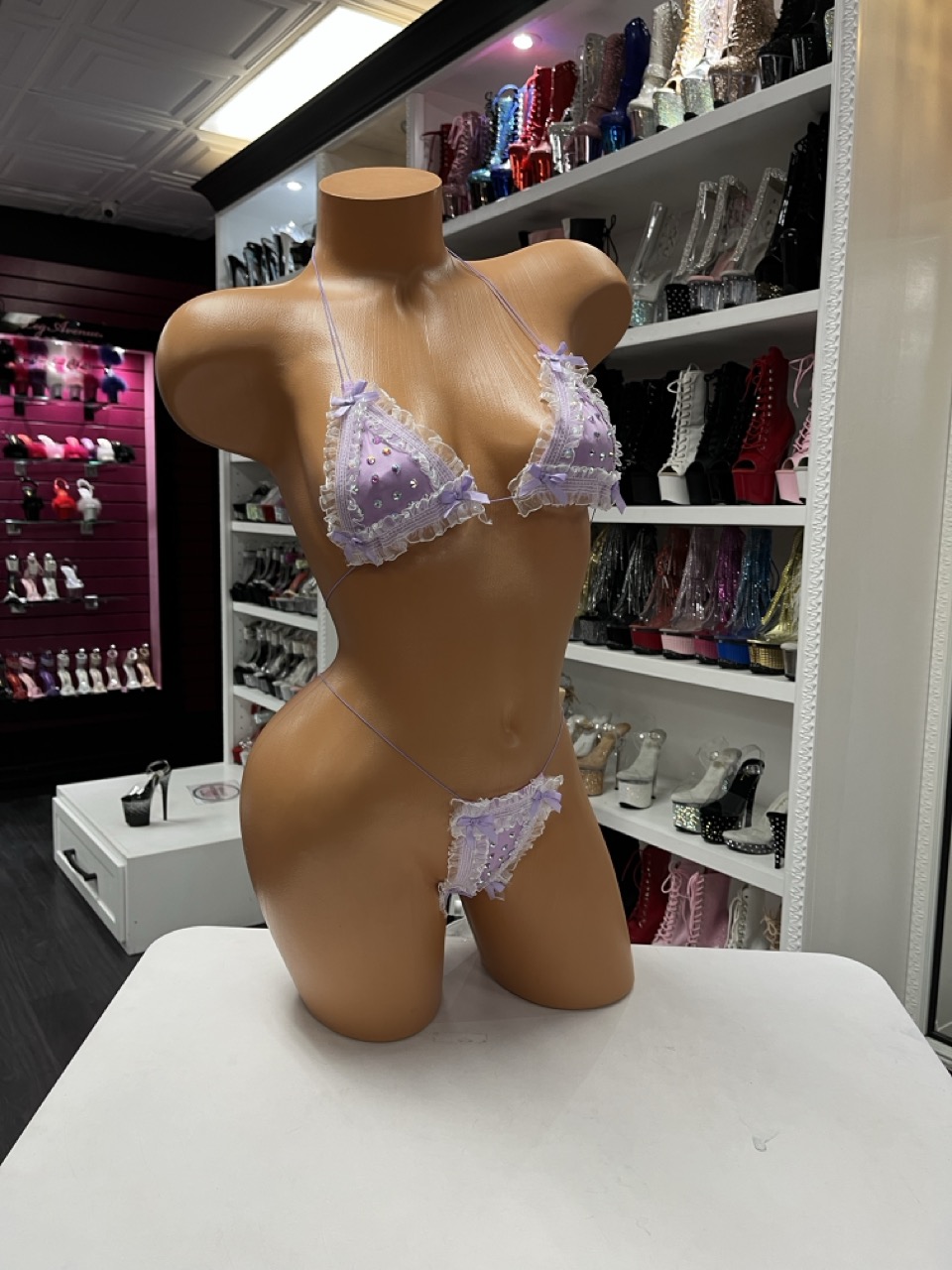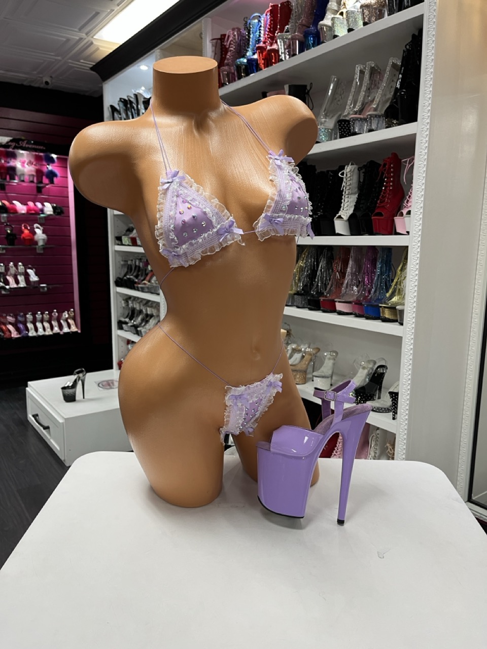 Lavender ruffle rhinestone bikini with bows and frill trim detailing