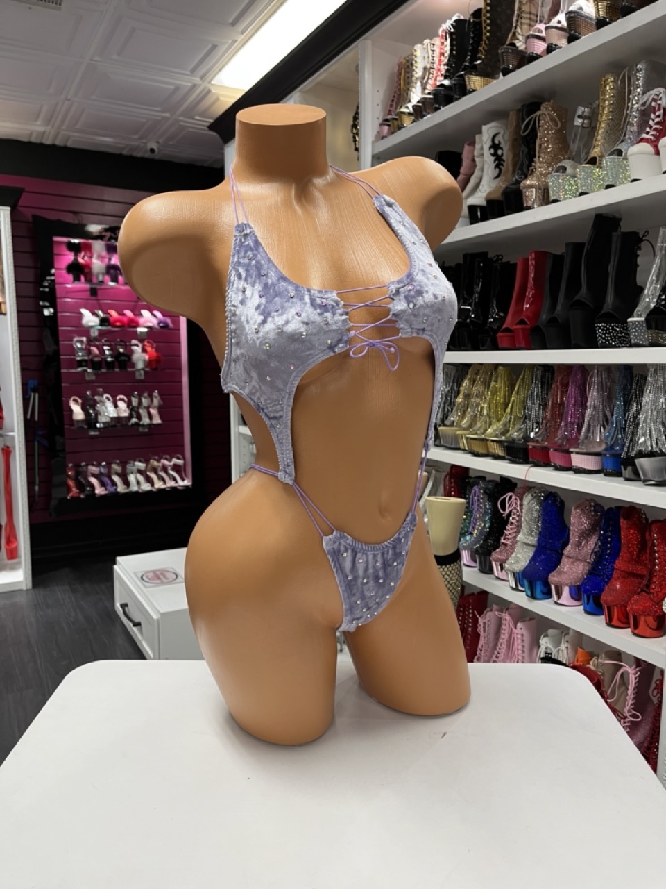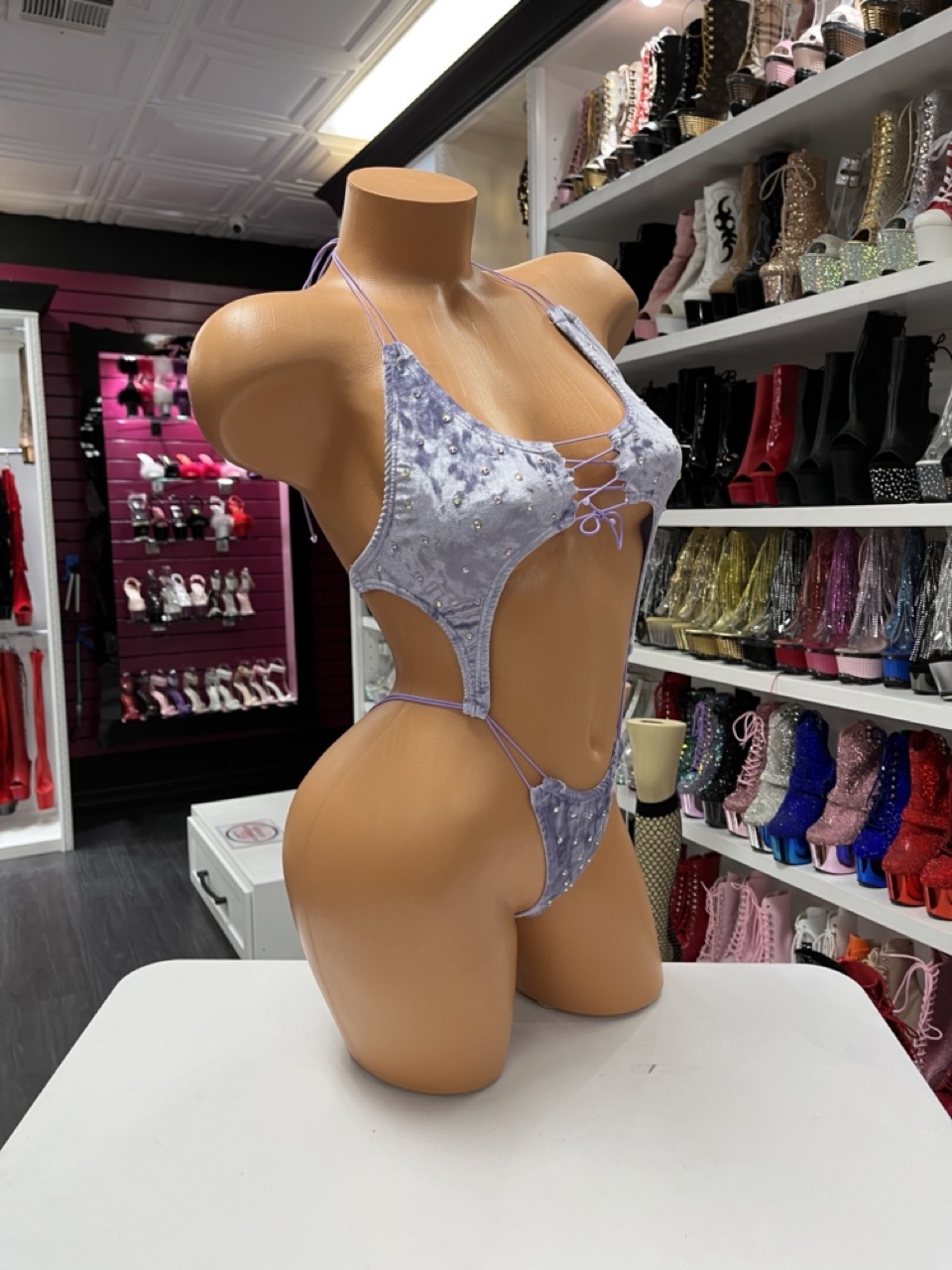 Lavender velvet rhinestone monokini with lace-up front, side cutouts, and high-cut bottom. Soft, sparkly, and stage-ready. Shoes not included.