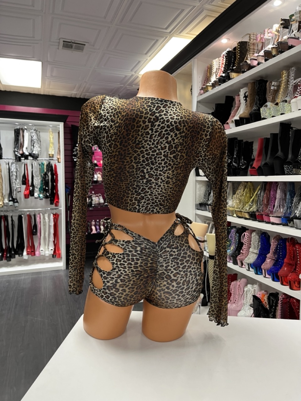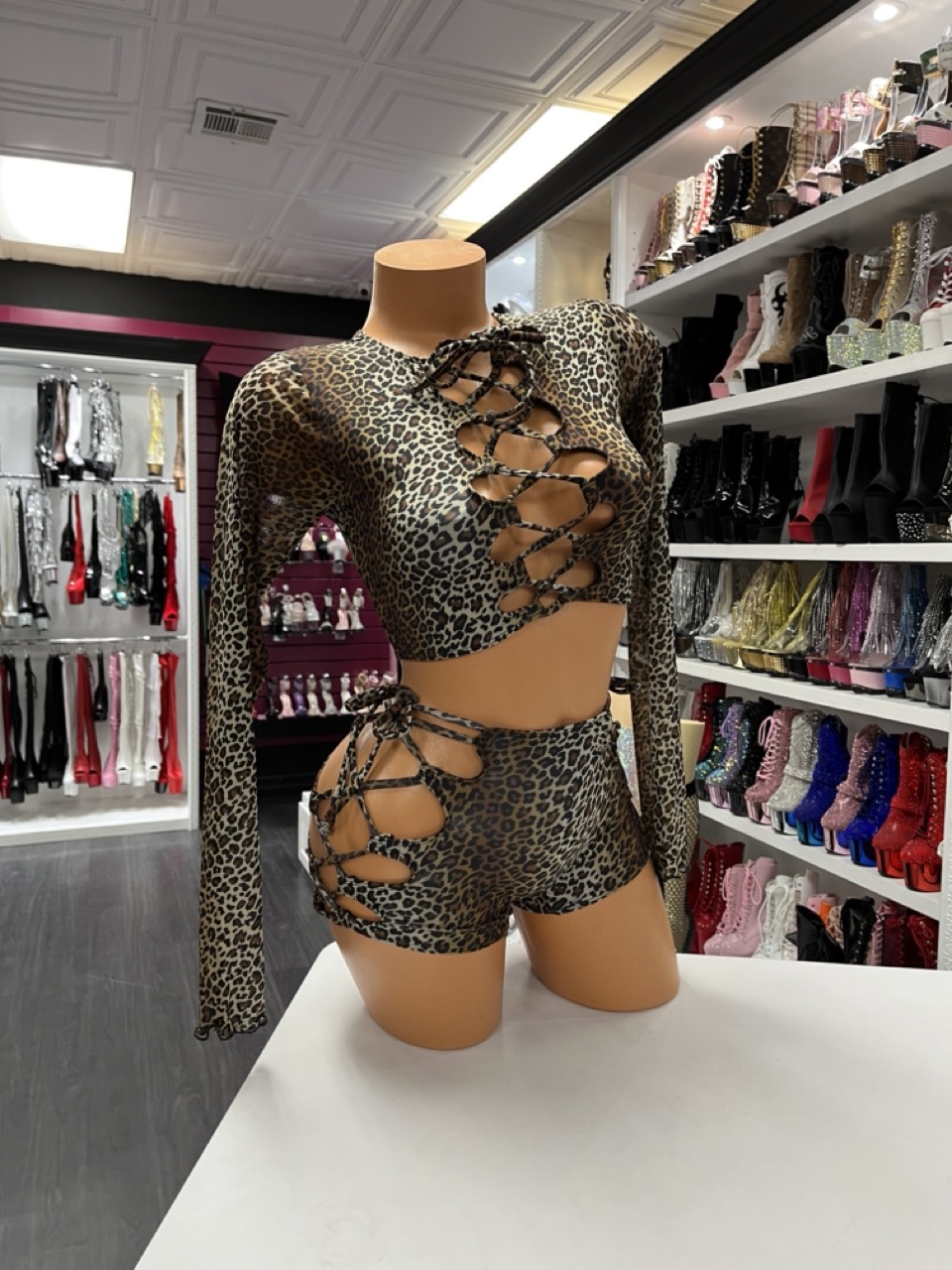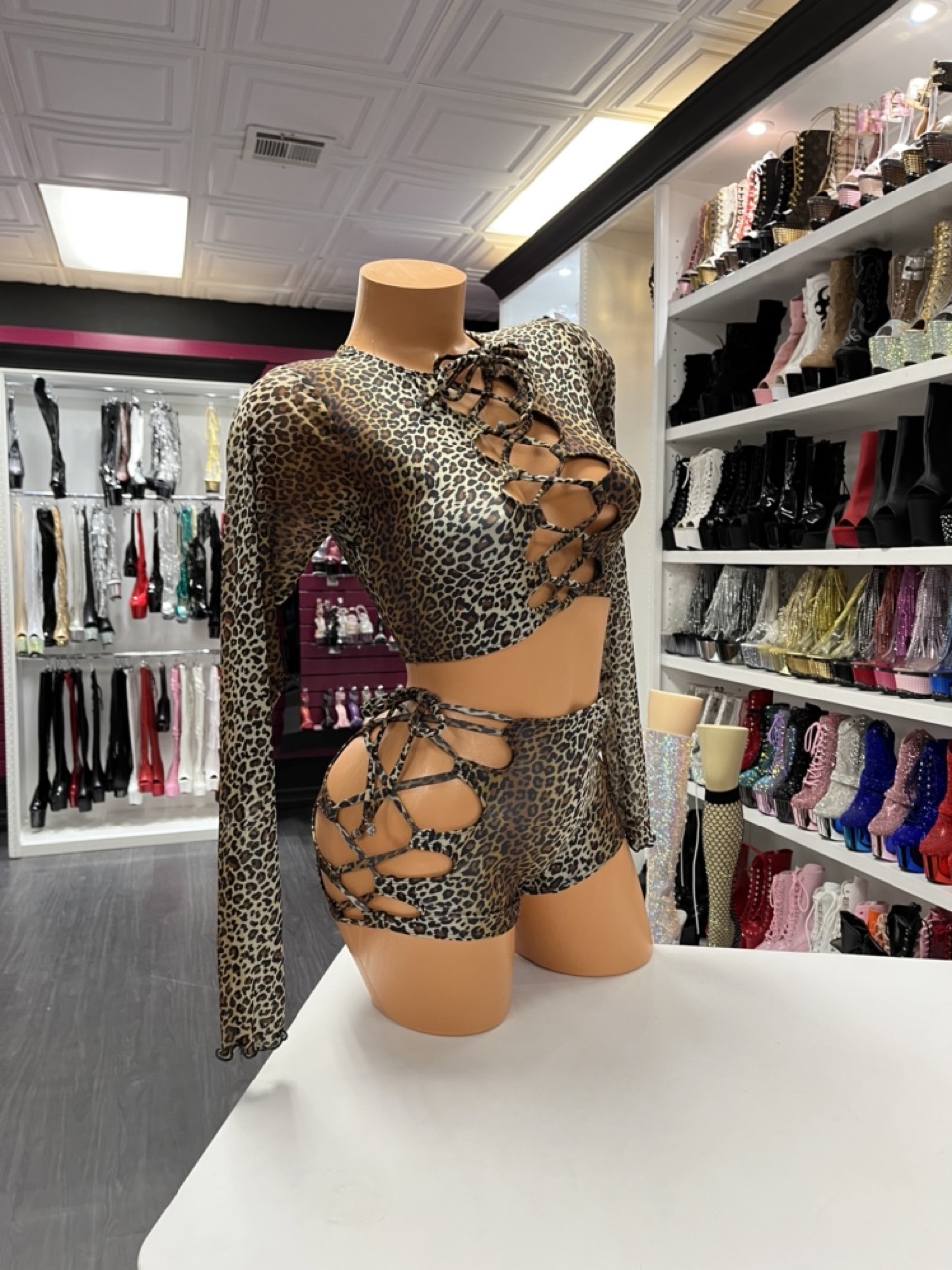A fierce leopard lace-up cutout set with long sleeves and matching side-laced shorts. Stretchy, bold, and perfect for dancers and themed nights.