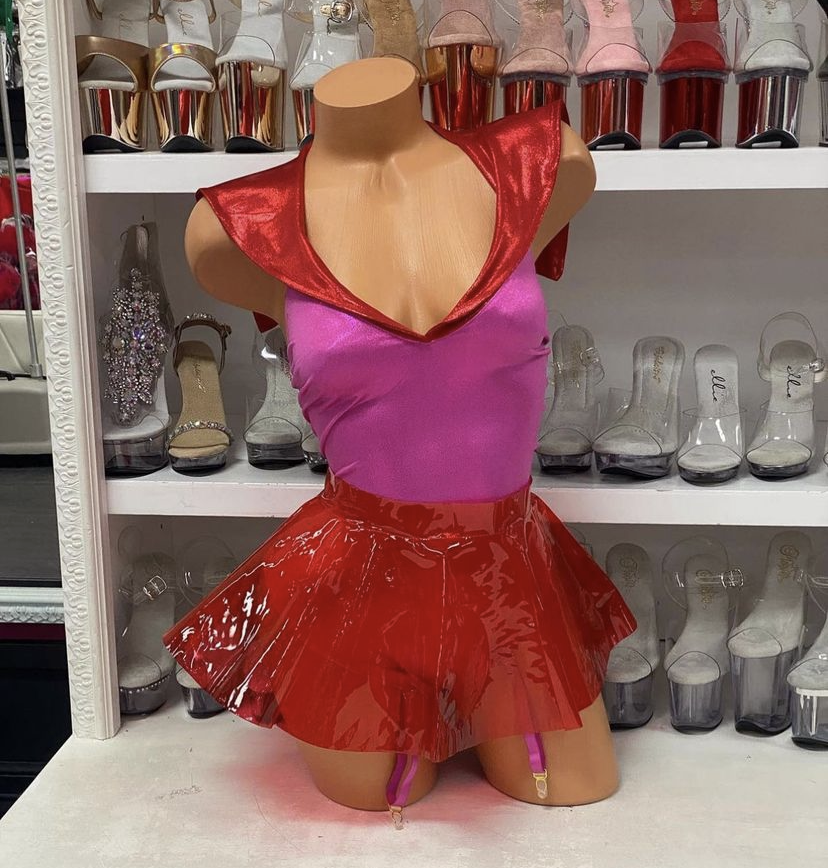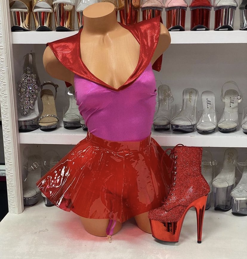 4pc. sexy cartoon character costume features metallic contrast collar bodysuit with garters paired with a PVC peplum skirt and leg accessories. No returns or exchanges.