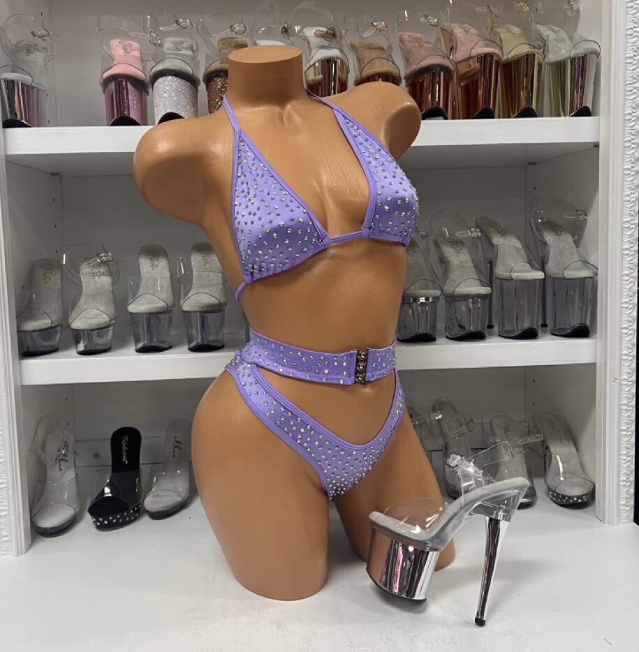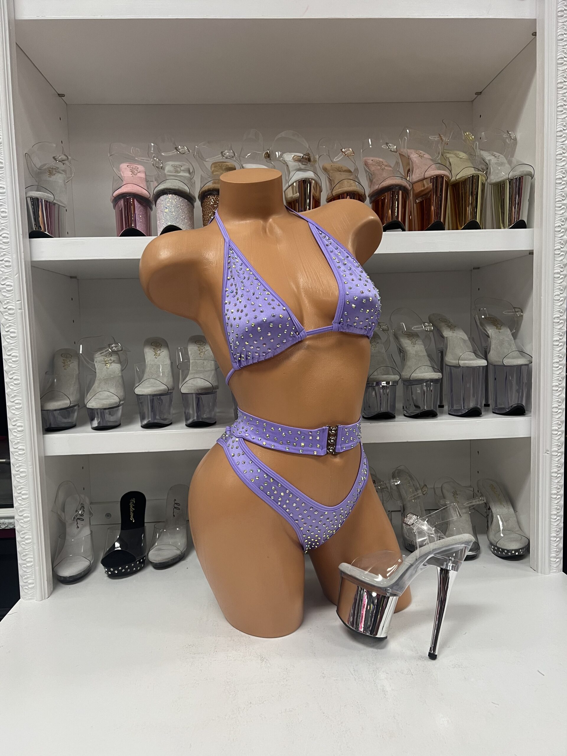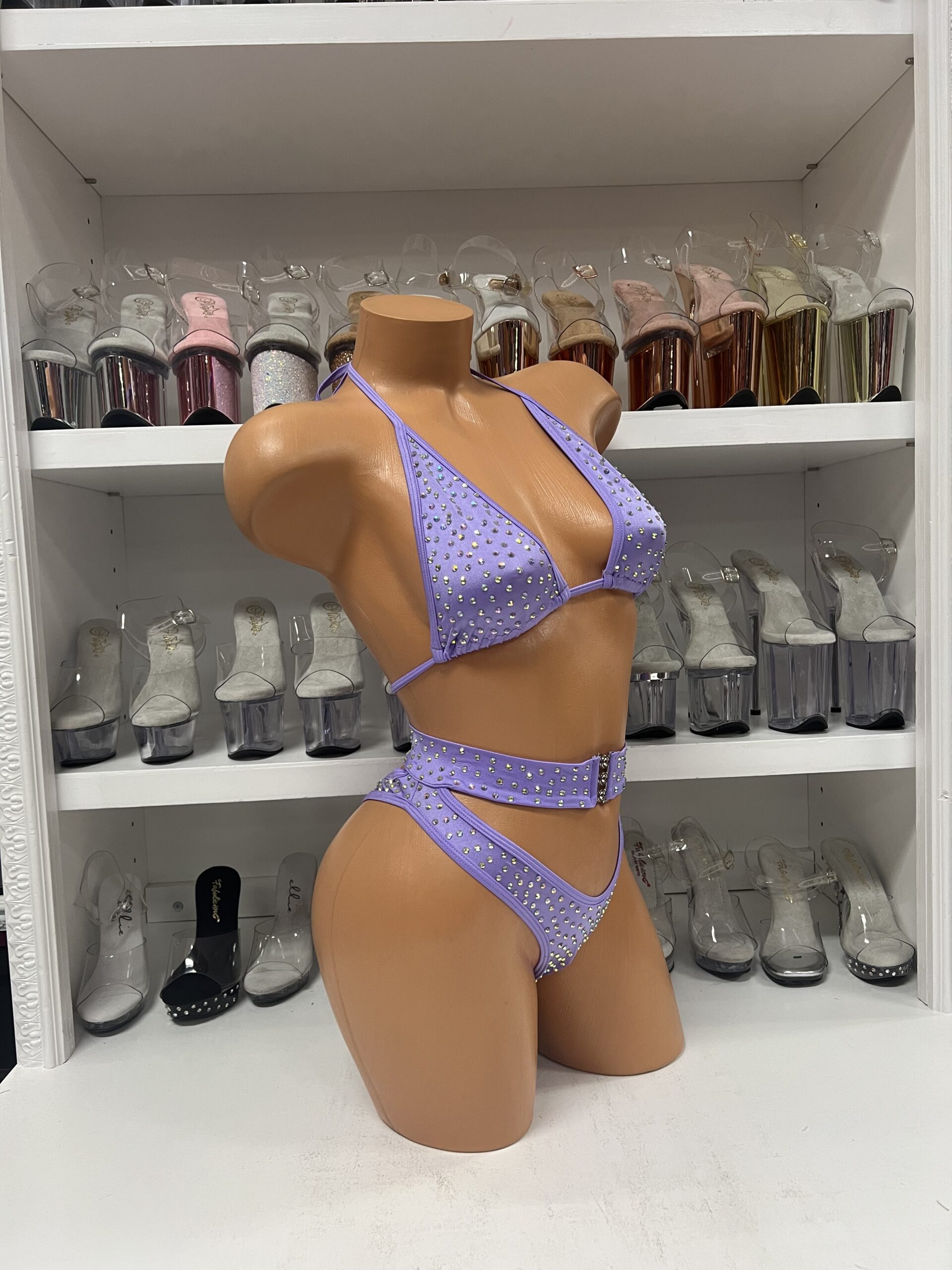 Lilac 2pc Solid Rhinestone High Waist With Buckle