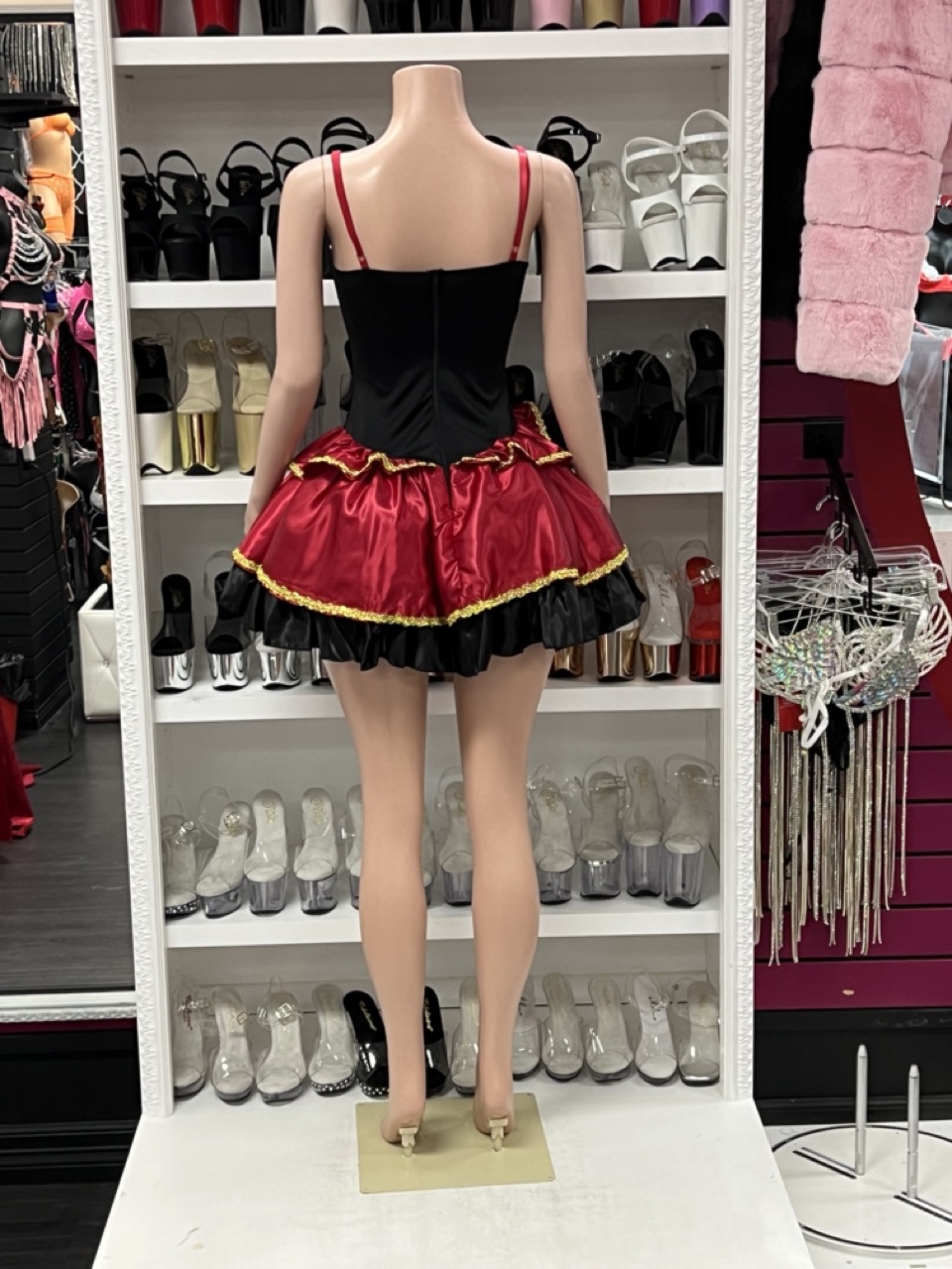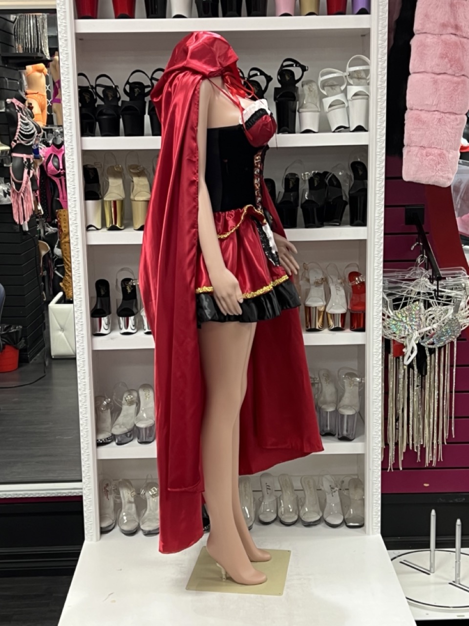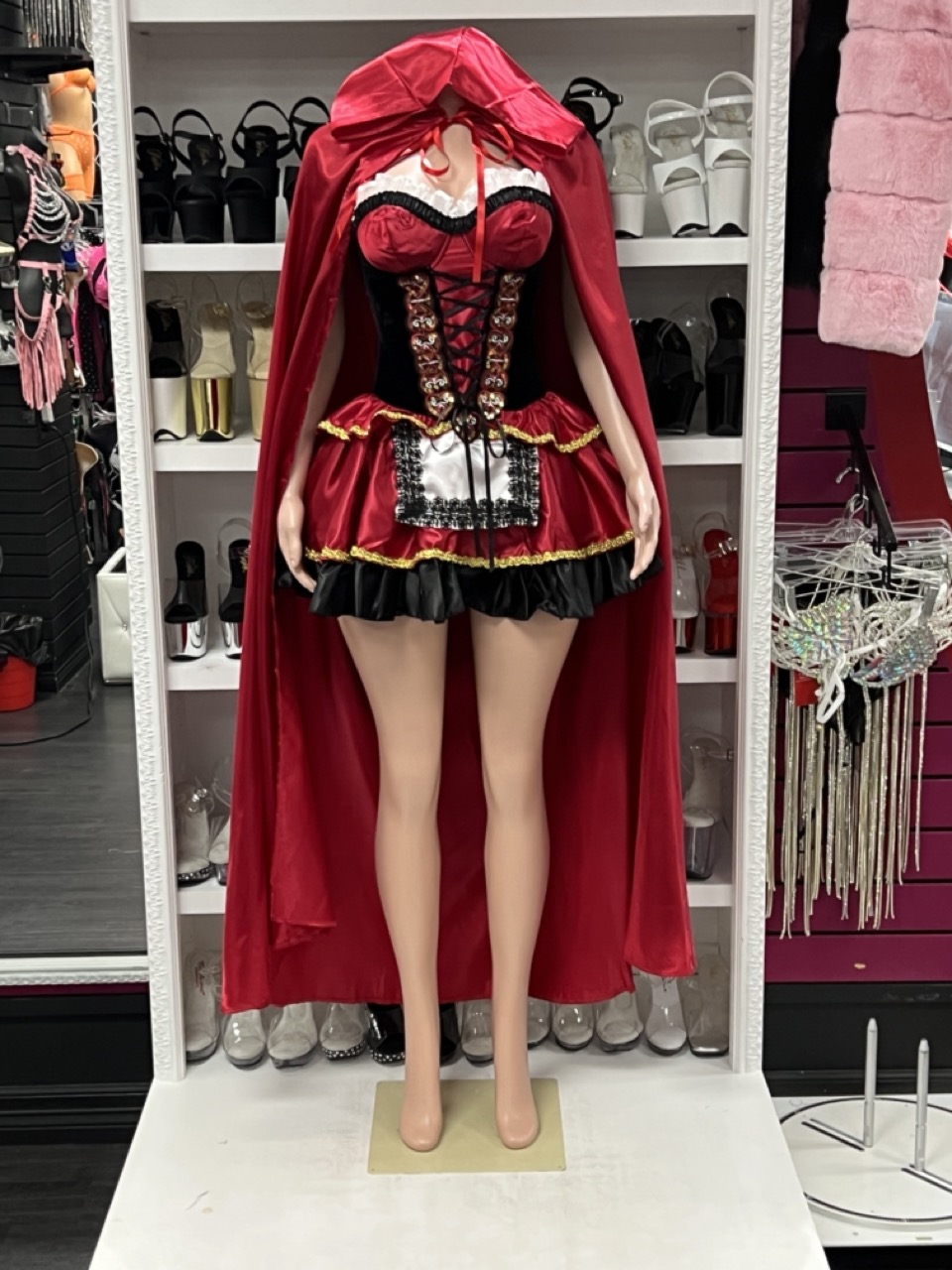 Step into fantasy with the Little Red Costume Set, featuring a corset-style red dress with apron and hooded satin cape.