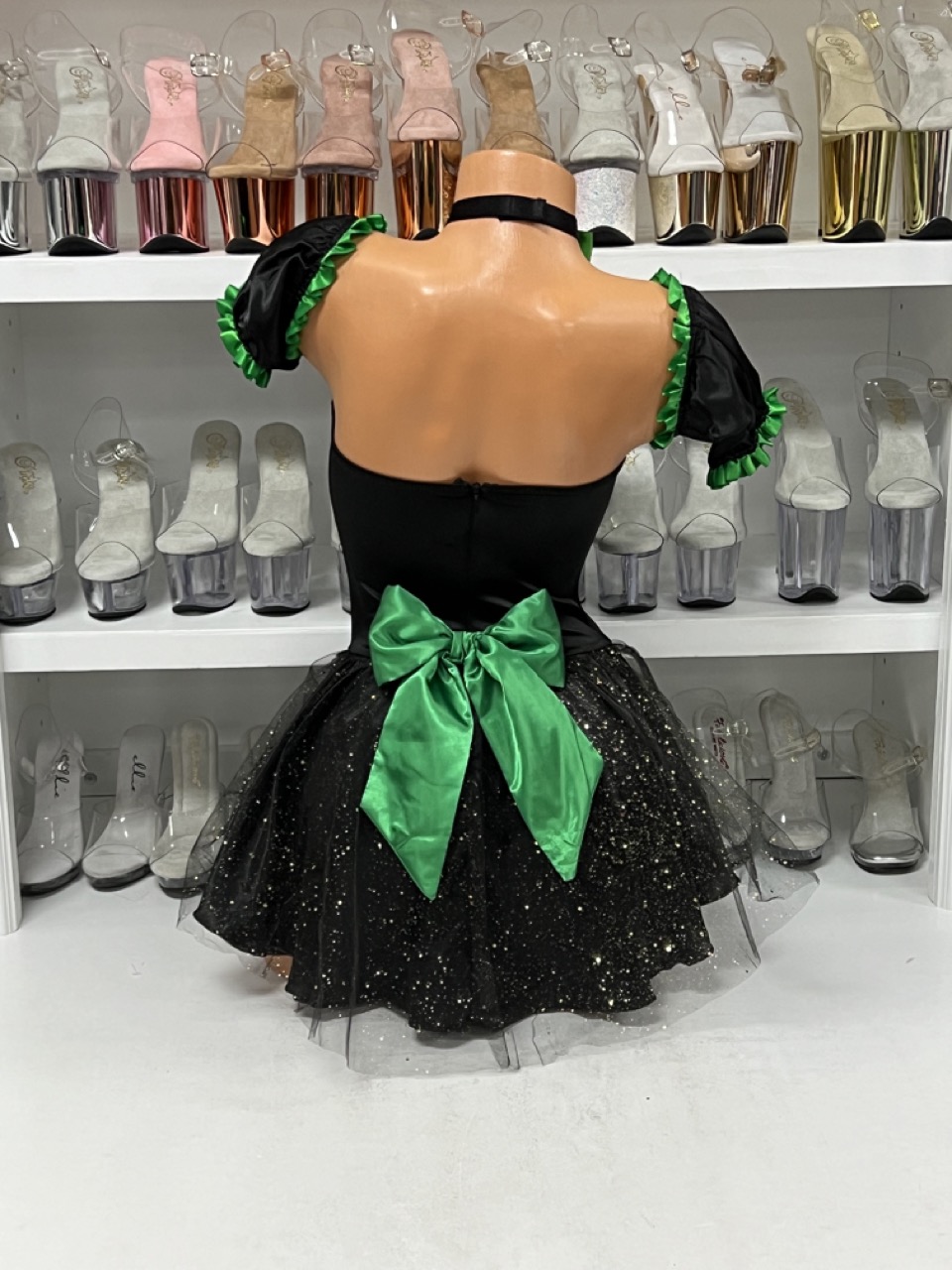 This charming Irish costume features a tulle glitter dress with vibrant green ruffles and four leaf clover print throughout for authentic Celtic appeal. The complete set includes a matching choker and coordinating arm puffs for total lucky beer girl transformation. The festive design combines traditional Irish symbolism with celebration styling perfect for St. Patrick’s themed events and Halloween parties. No returns or exchanges.