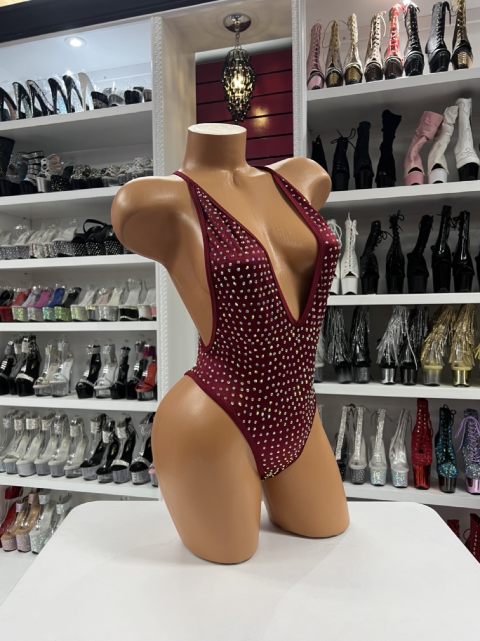 Maroon rhinestone plunge bodysuit with a high-cut fit and smooth stretch. Bold, glamorous, and perfect for stage performers.
