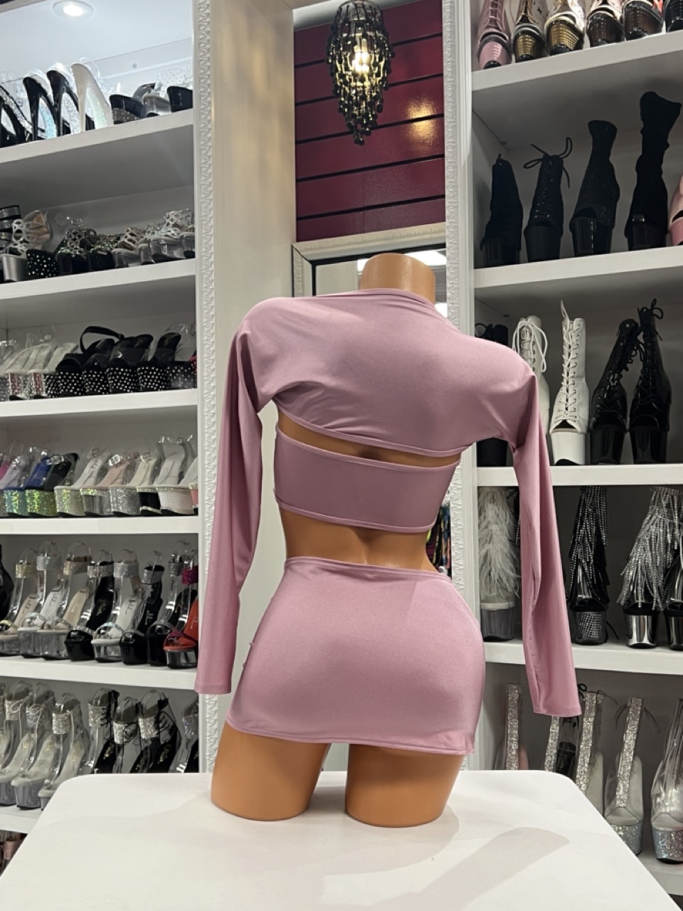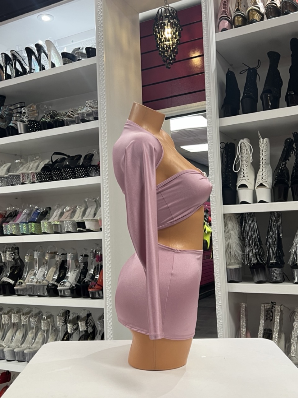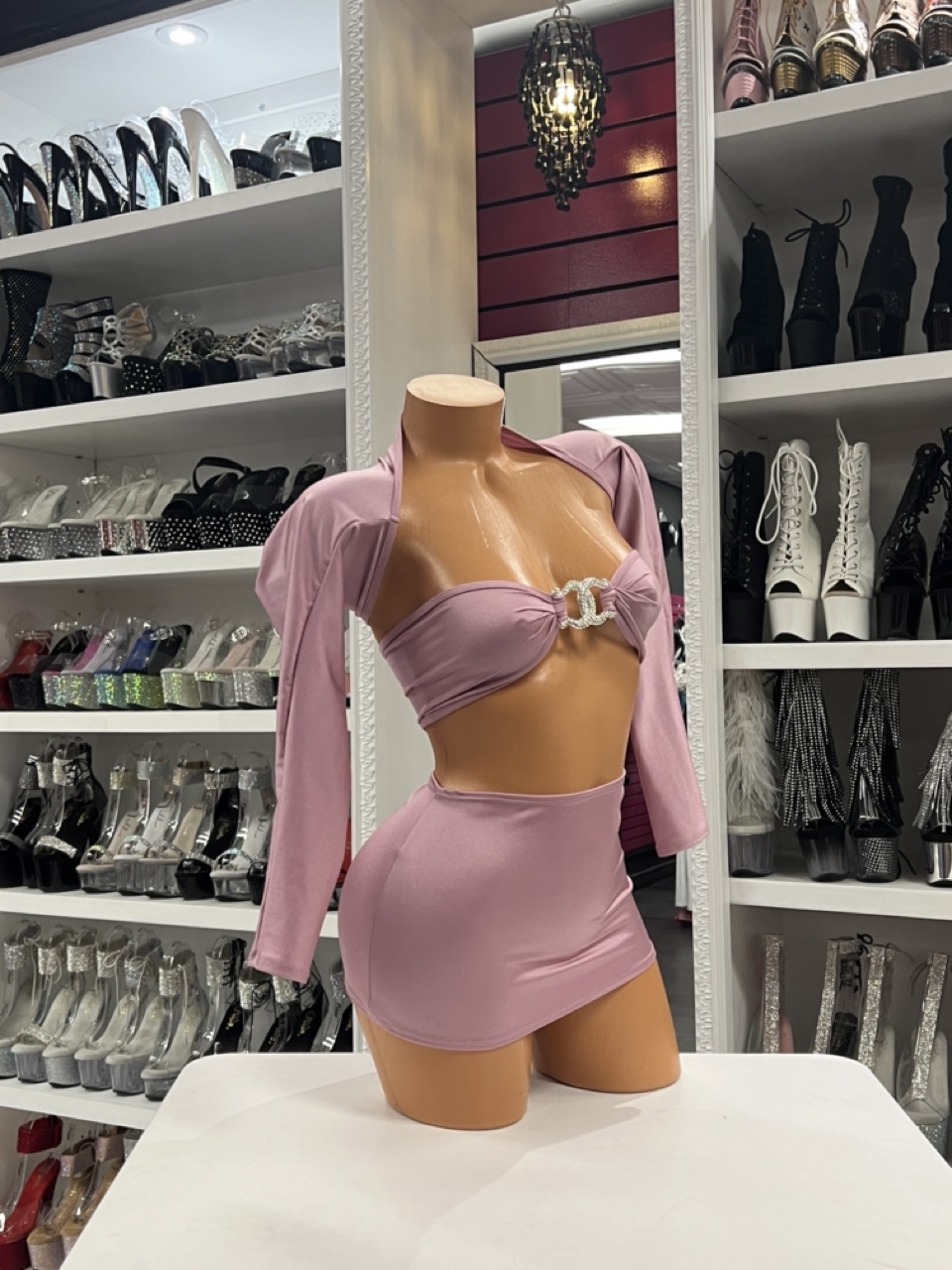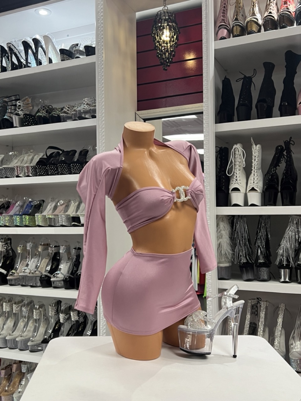 A soft mauve three-piece mini set with a rhinestone bandeau top, bolero shrug, and smooth stretch skirt. Elegant, sexy, and perfect for dancers.