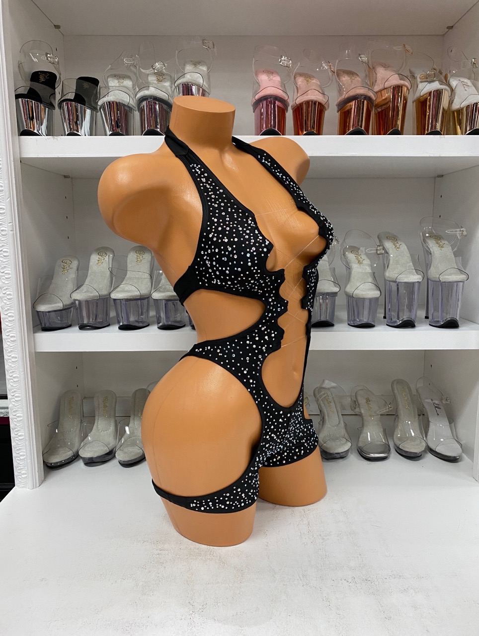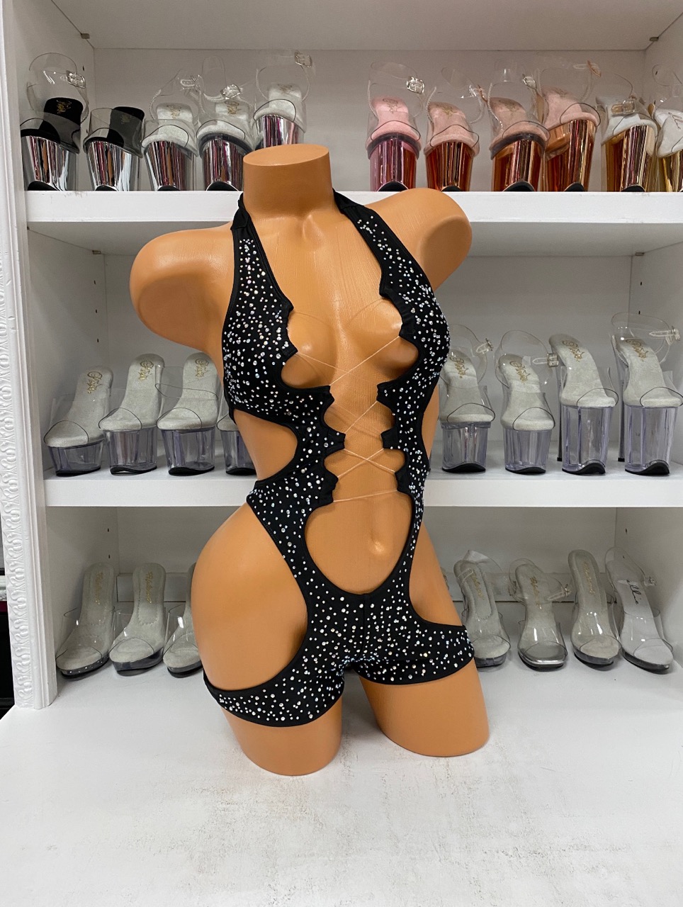 Front view of a glossy mannequin wearing a black rhinestone romper with sculpted cutouts and center lace-up front, posed next to a black peep-toe platform boot with rhinestones, displayed in a boutique with shelves of high heels in the background.