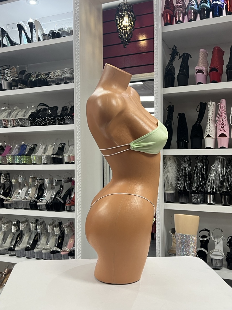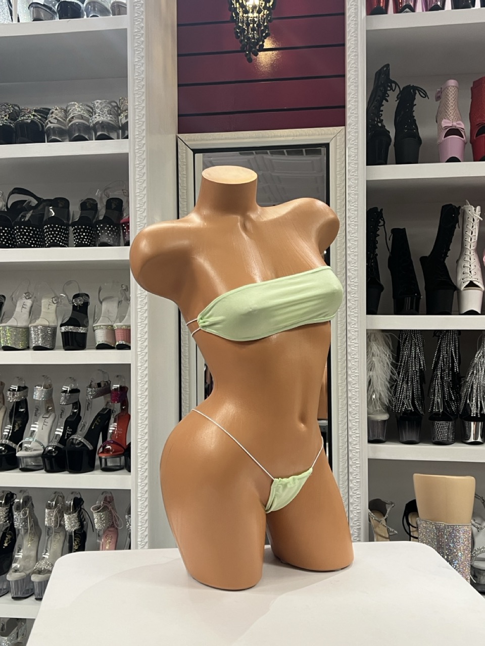A mint green bandeau bikini with a clean, minimal micro cut. Designed for performers who love fresh color and confident simplicity.