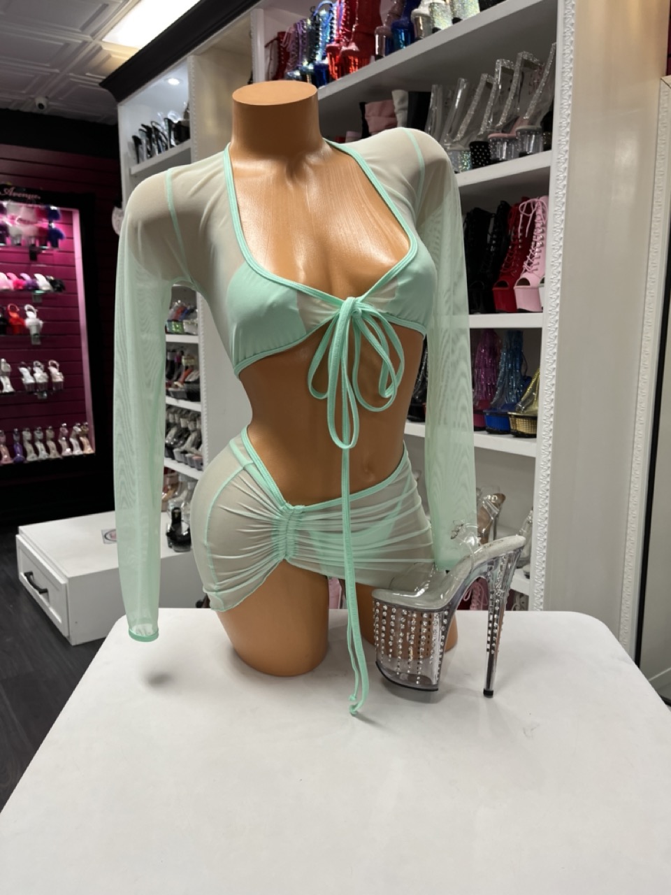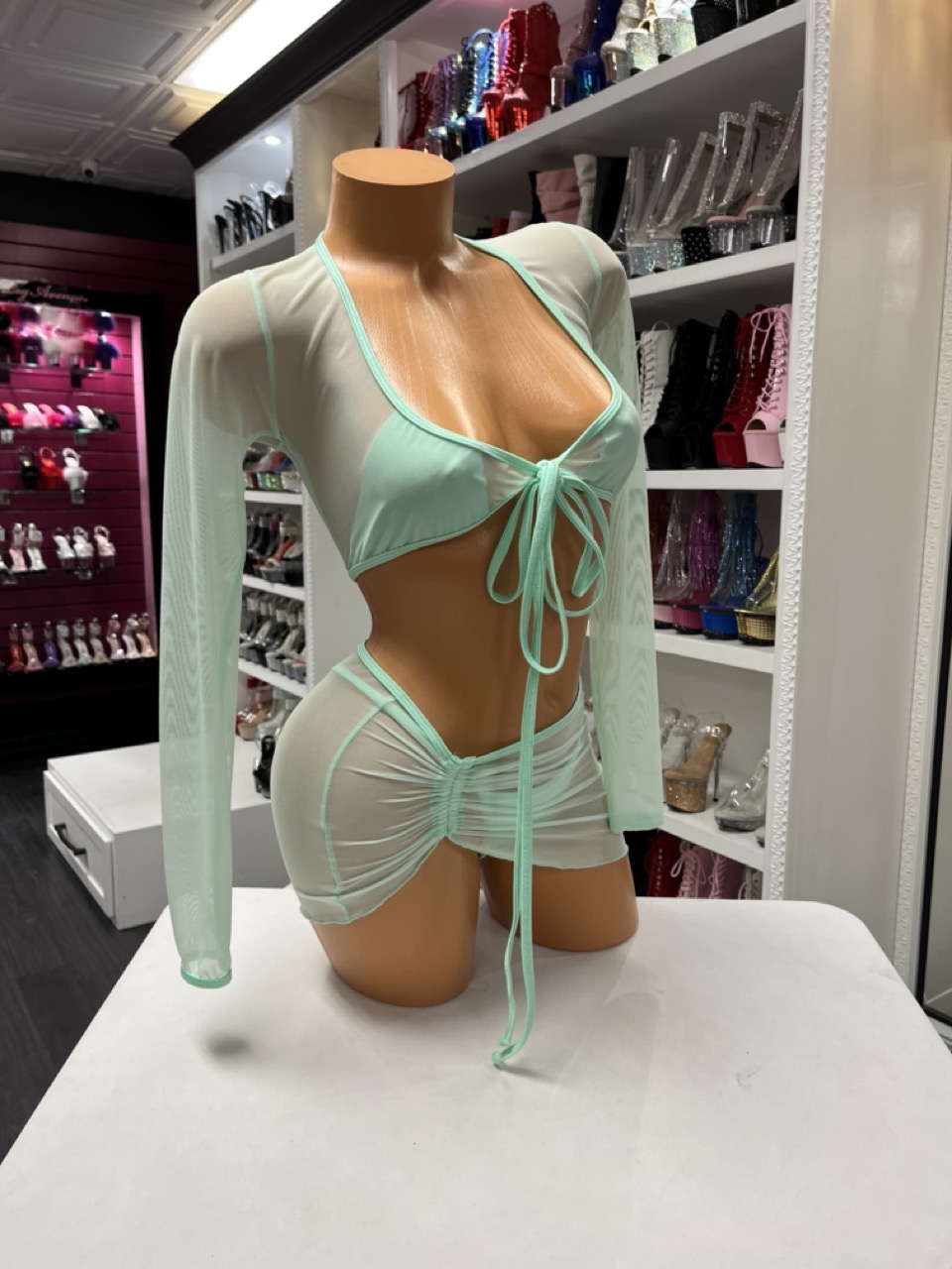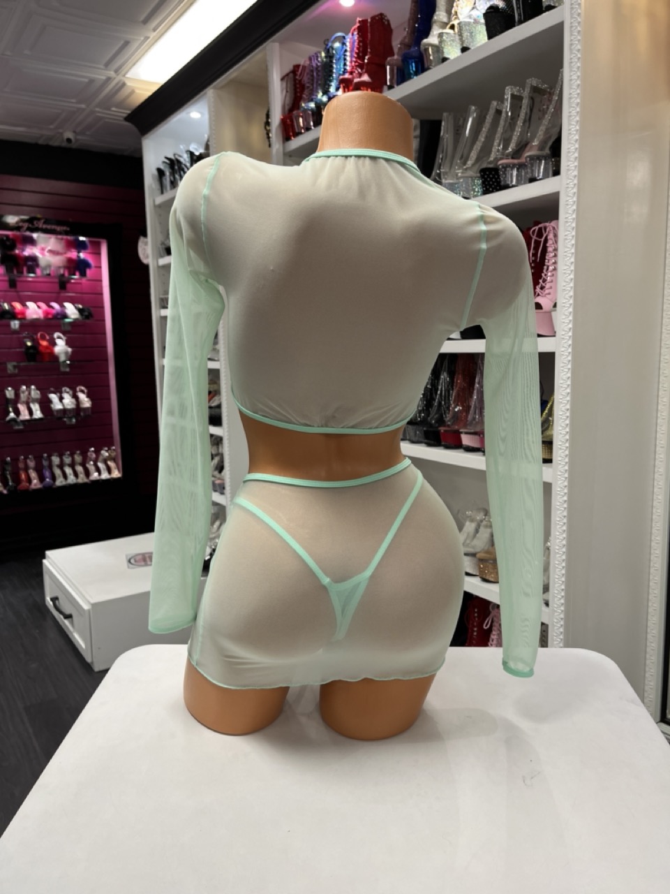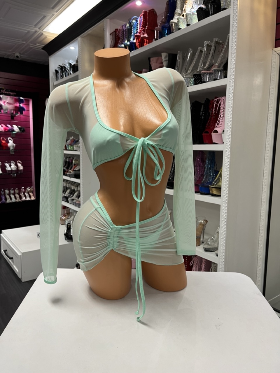 Mint Mesh Skirt Set delivers a soft, sheer look with a flattering fit. This set includes a top, thong, and ruched mini skirt.
