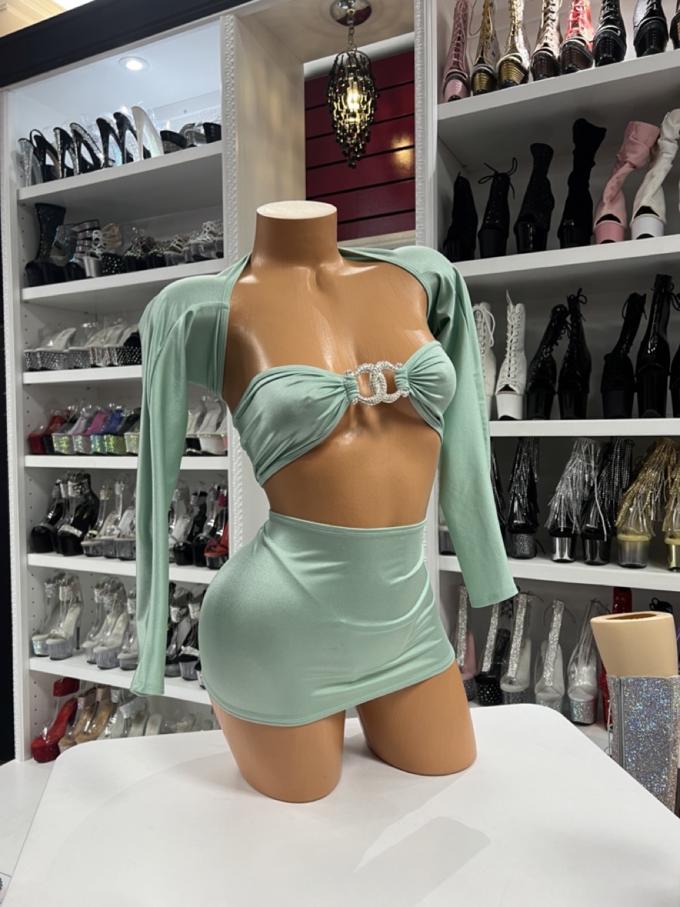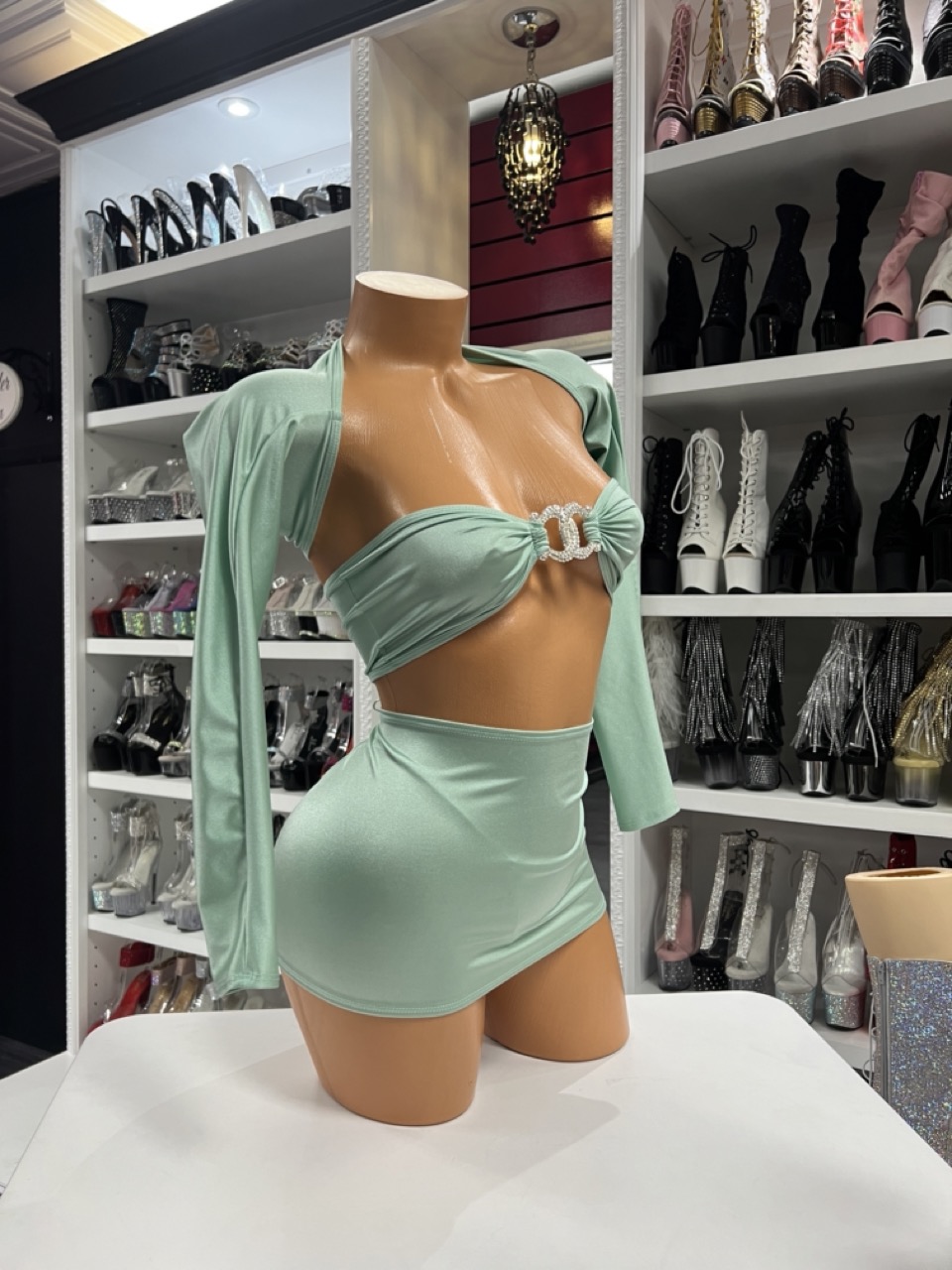 A soft mint mini set with a rhinestone buckle and long sleeves. This elegant, stretchy outfit offers comfort, shine, and a feminine stage look.