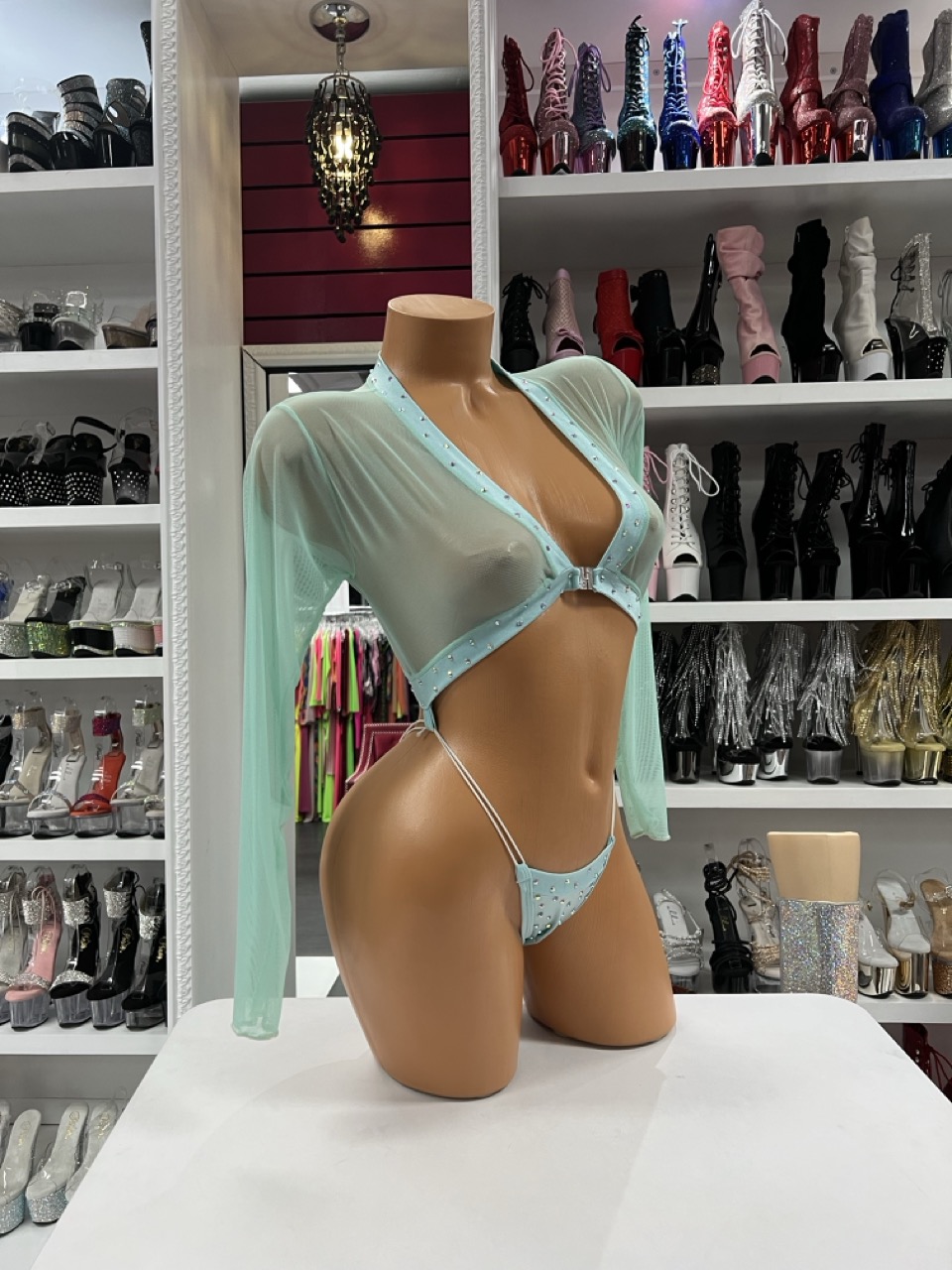 Mint sheer rhinestone romper with long mesh sleeves, deep V neckline, and sparkling crystal trim.