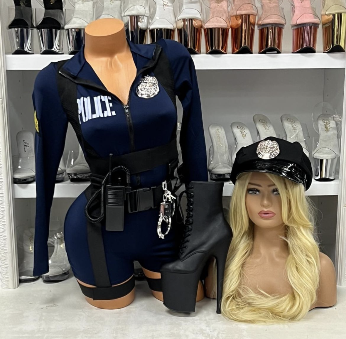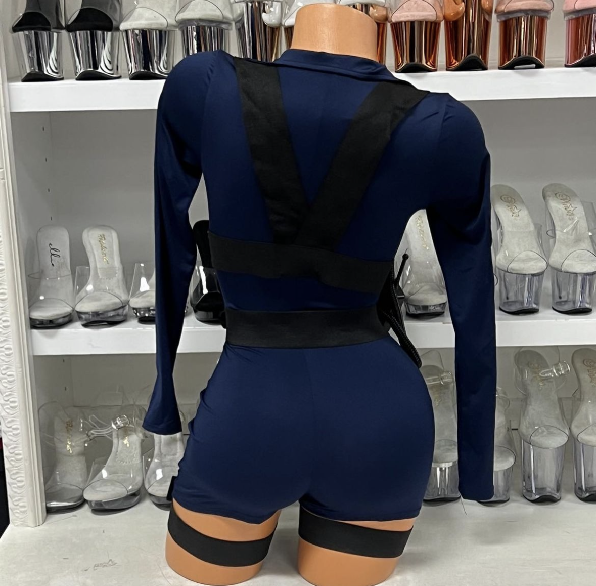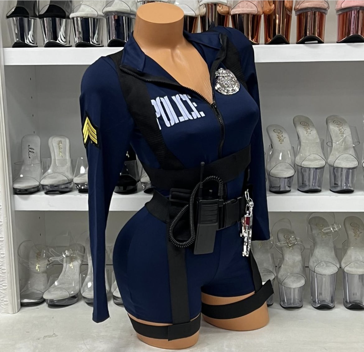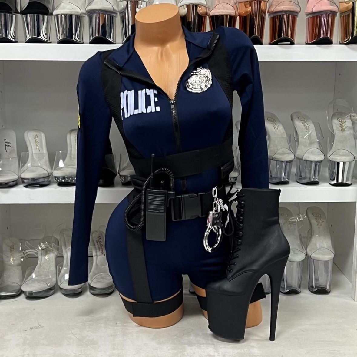 6 PC Handcuff Hottie, includes zip up romper, pin-on badge, garter body harness, toy walkie talkie and handcuffs, and police hat. No returns or exchanges.