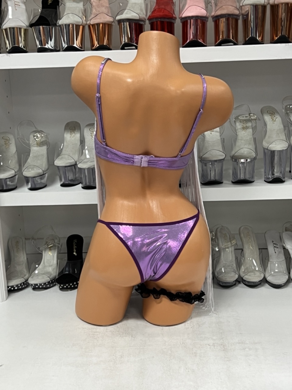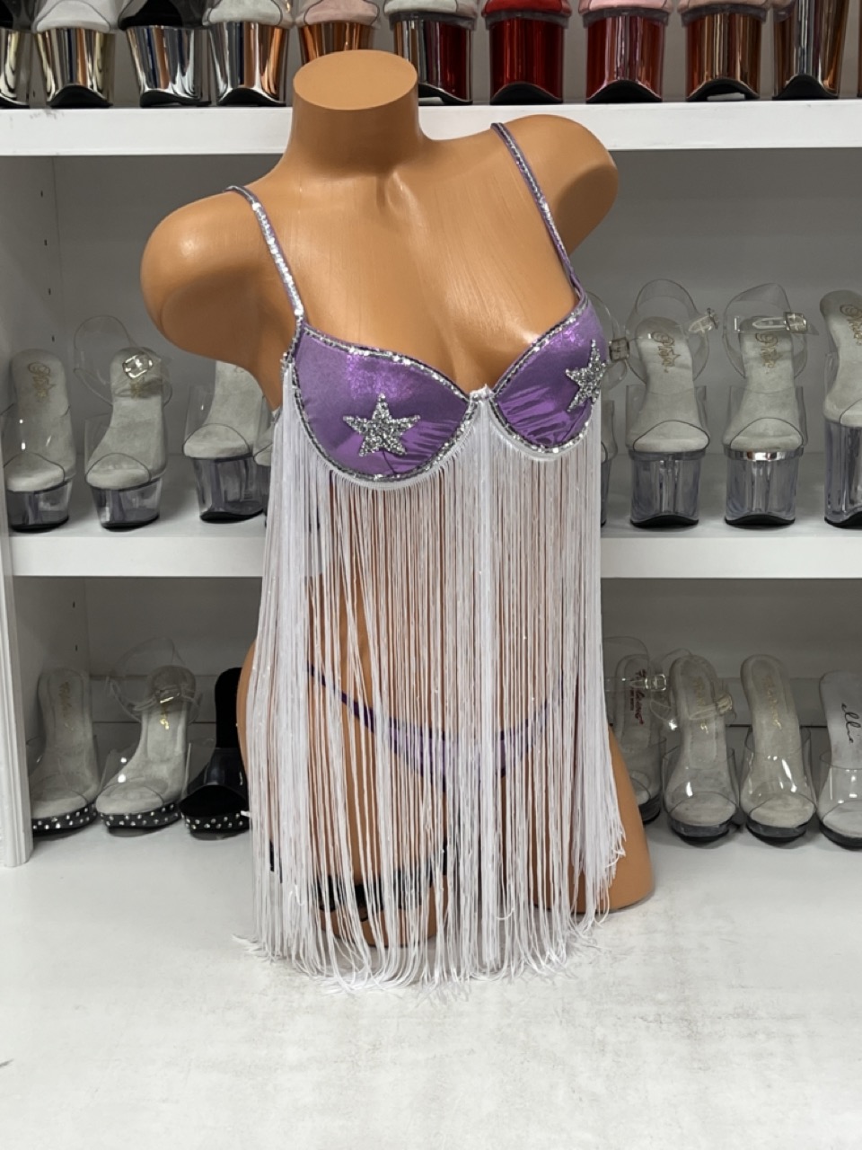 Lavender Forplay Need You Closer Costume Set with rhinestone stars, fringe bra, matching panty, and pink wig. Sparkly, flirty, and unforgettable.