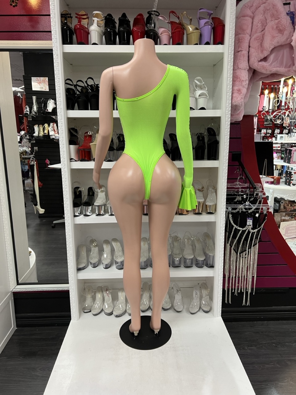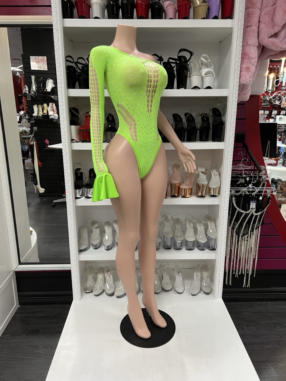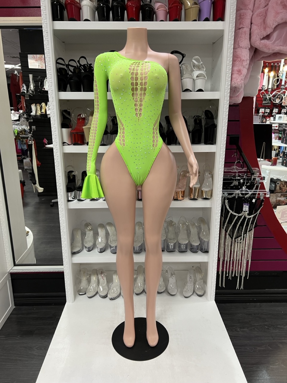 Make a bold entrance in this electric neon green one-sleeve bodysuit. Covered in sparkling rhinestones and cut with edgy fishnet panels, this asymmetrical piece is designed to turn heads. Whether you’re center stage or center of attention, this outfit brings the heat with high-cut legs and body-contouring stretch.