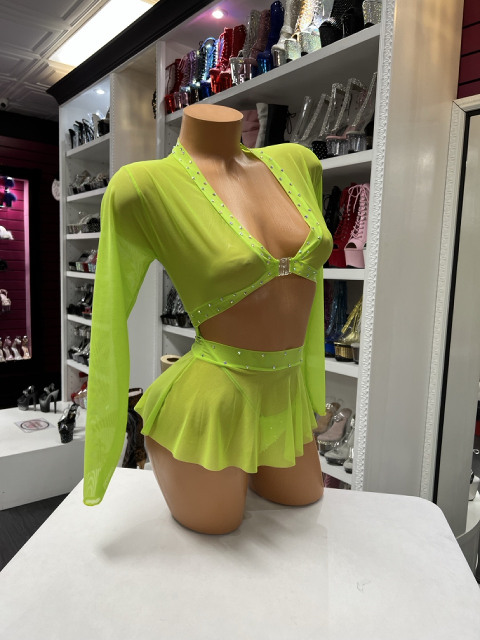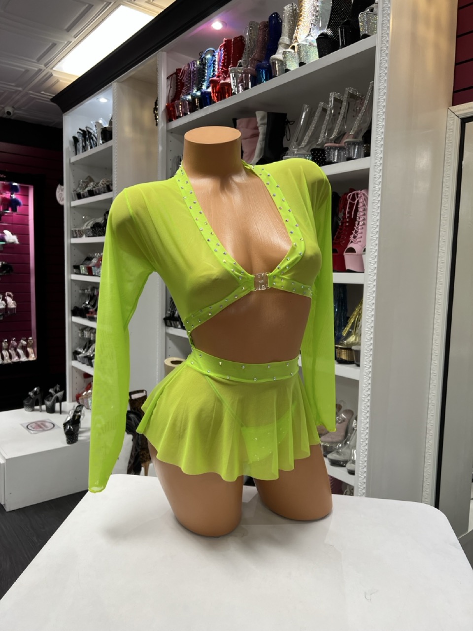 A neon green skirt set with long sleeve top and ruffled mini skirt. Perfect for bold performances and standout nightlife looks.