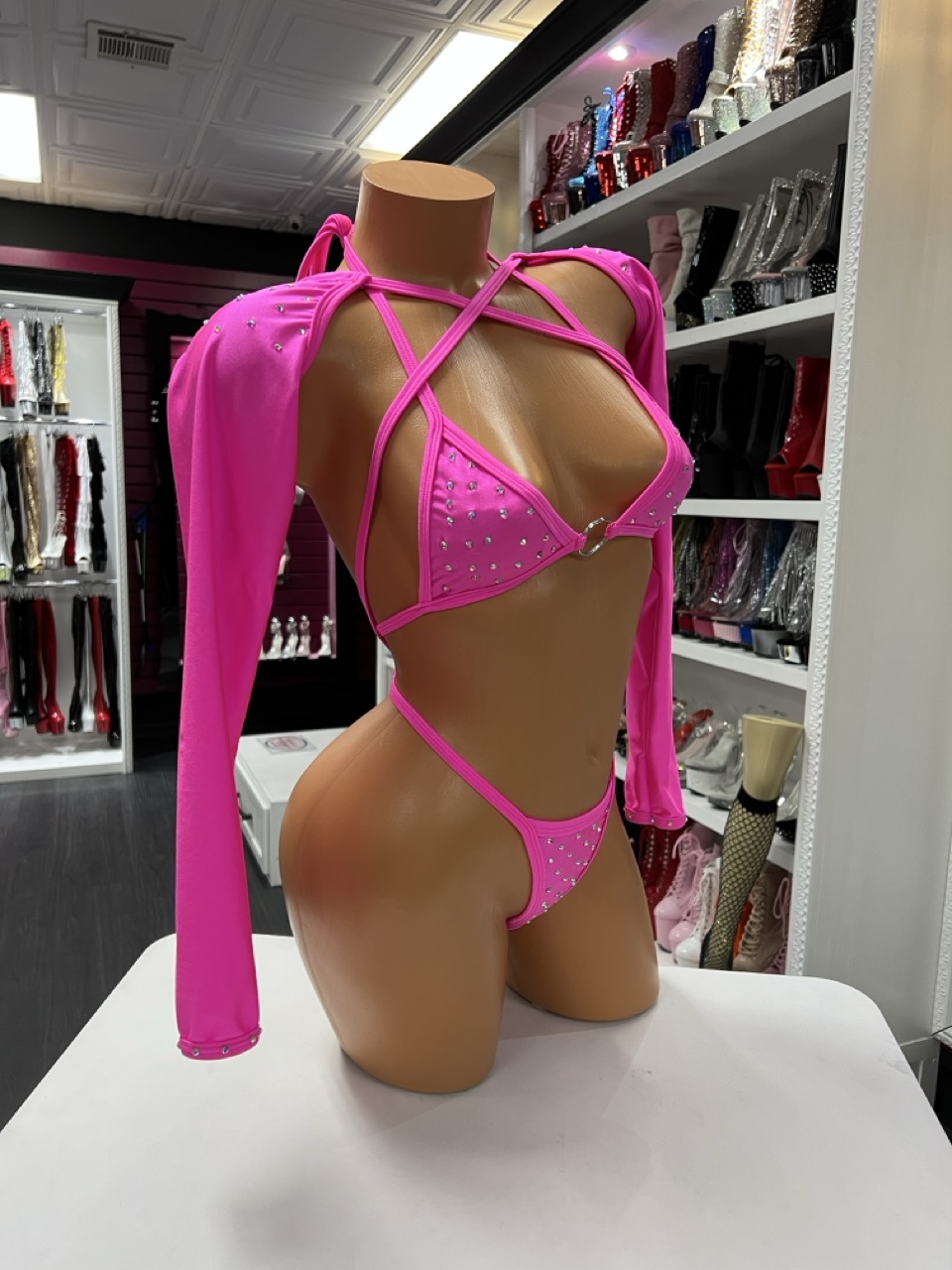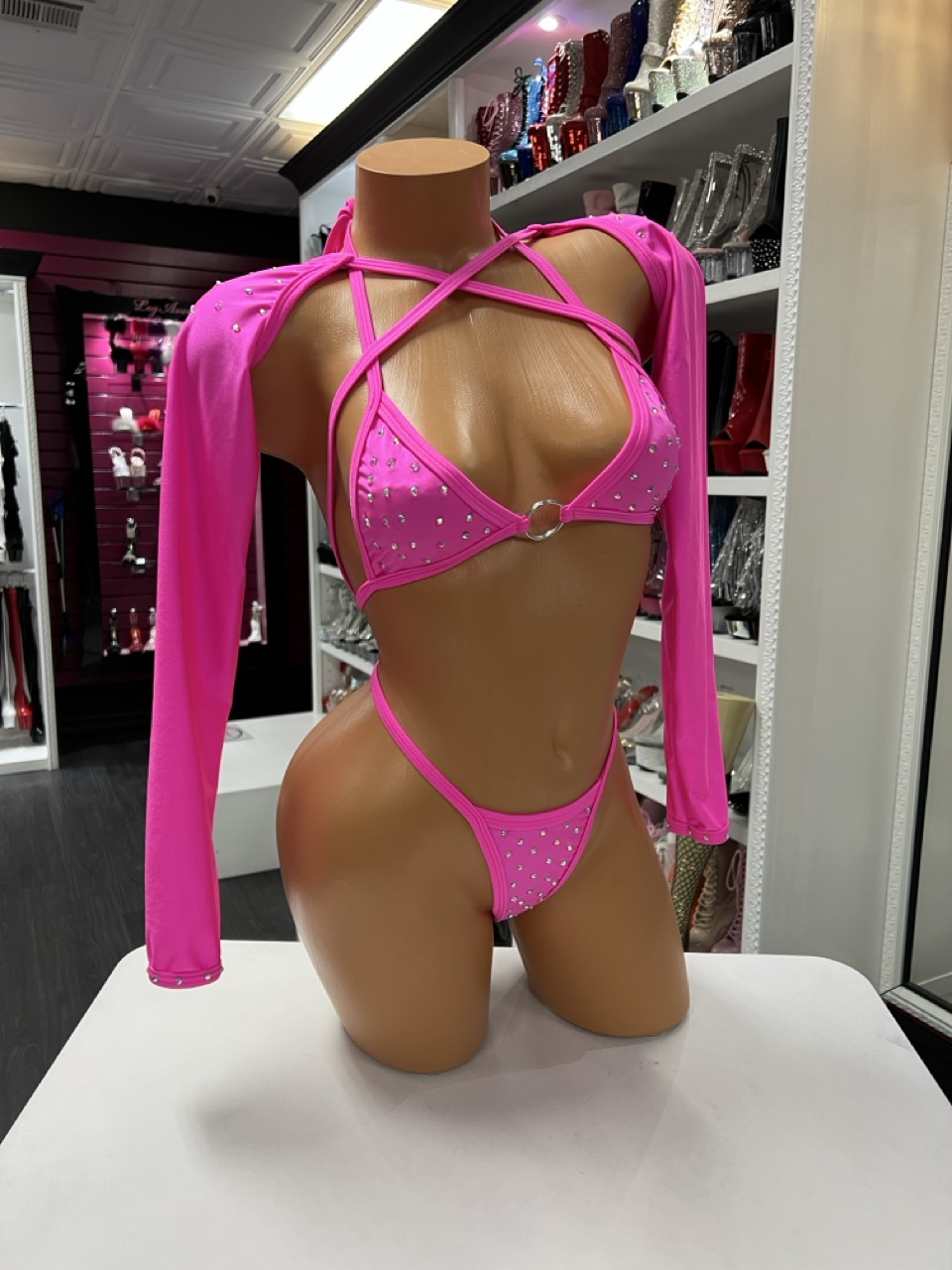 A neon pink crystal strap 2 piece sling set with dramatic arm sleeves and adjustable fit for bold stage presence and confident movement.