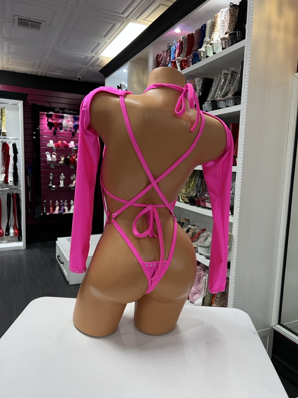 Neon pink crystal strap performance set with long sleeves and multi-strap design displayed on mannequin