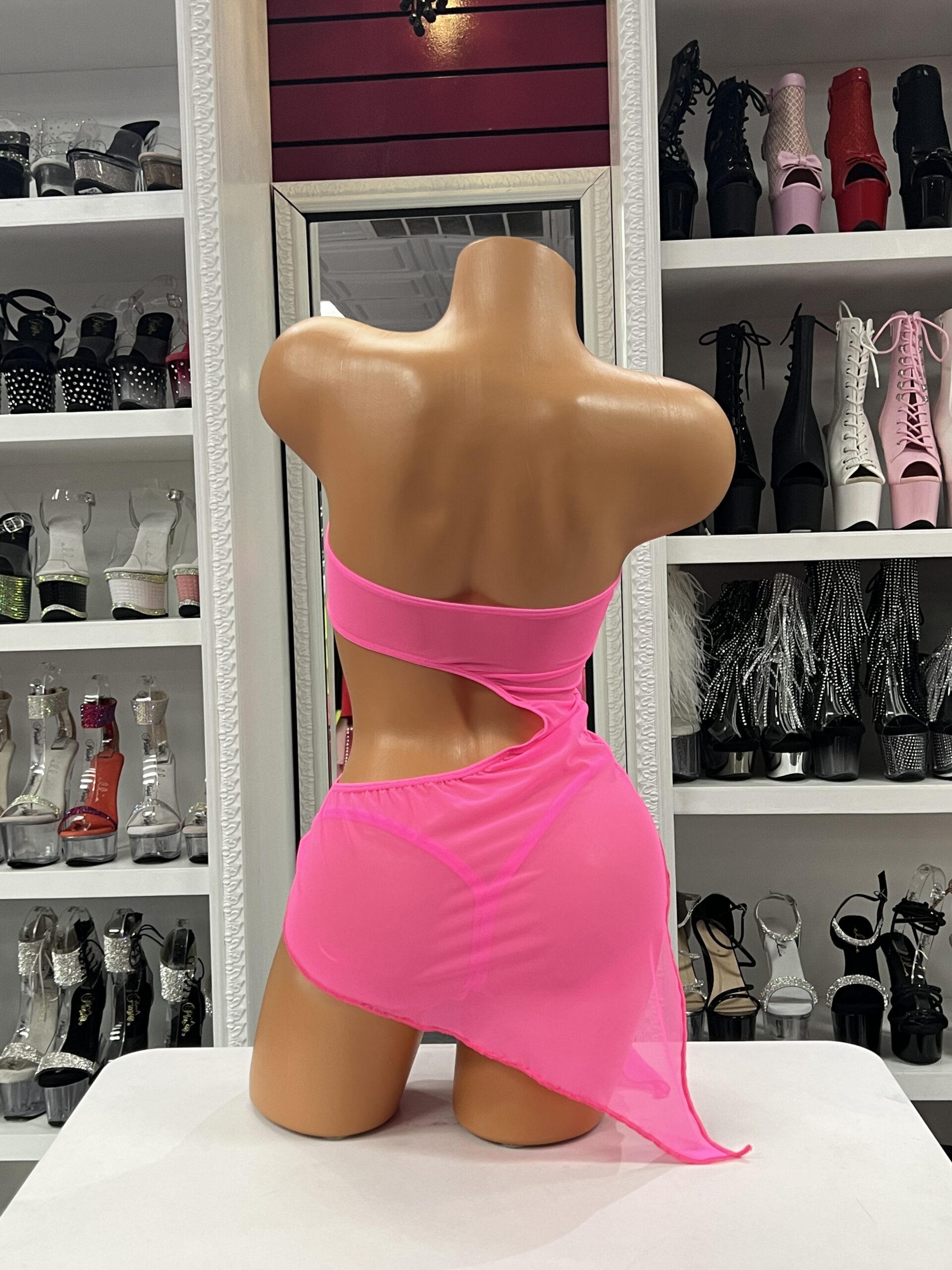 Neon pink strapless mini dress with dramatic waist cutout and sheer asymmetrical overlay. Bold color with sculpted stage appeal.