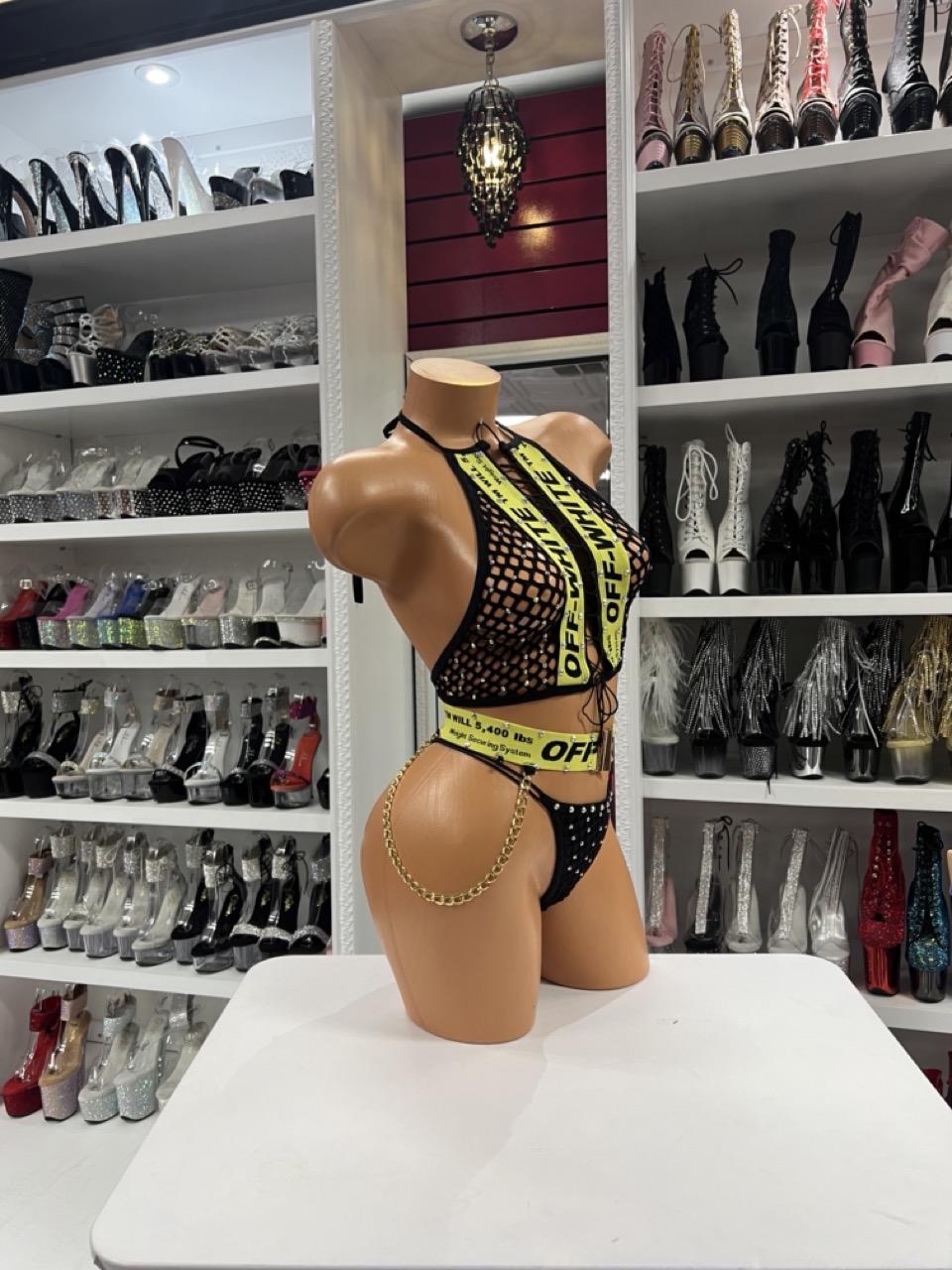 A bold neon utility mesh set featuring urban-inspired straps, fishnet shaping, and rhinestone sparkle. This flexible, edgy design delivers runway energy and stage-ready comfort.
