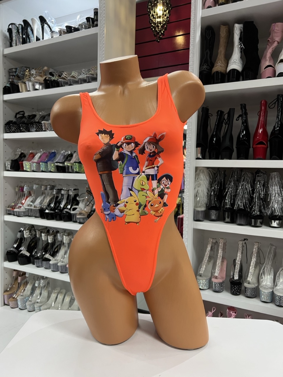 Orange anime print high-cut bodysuit on mannequin with matching platform boot