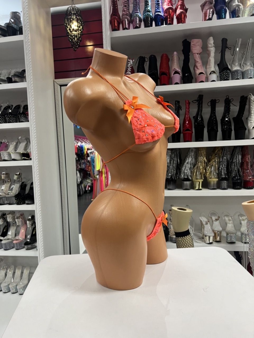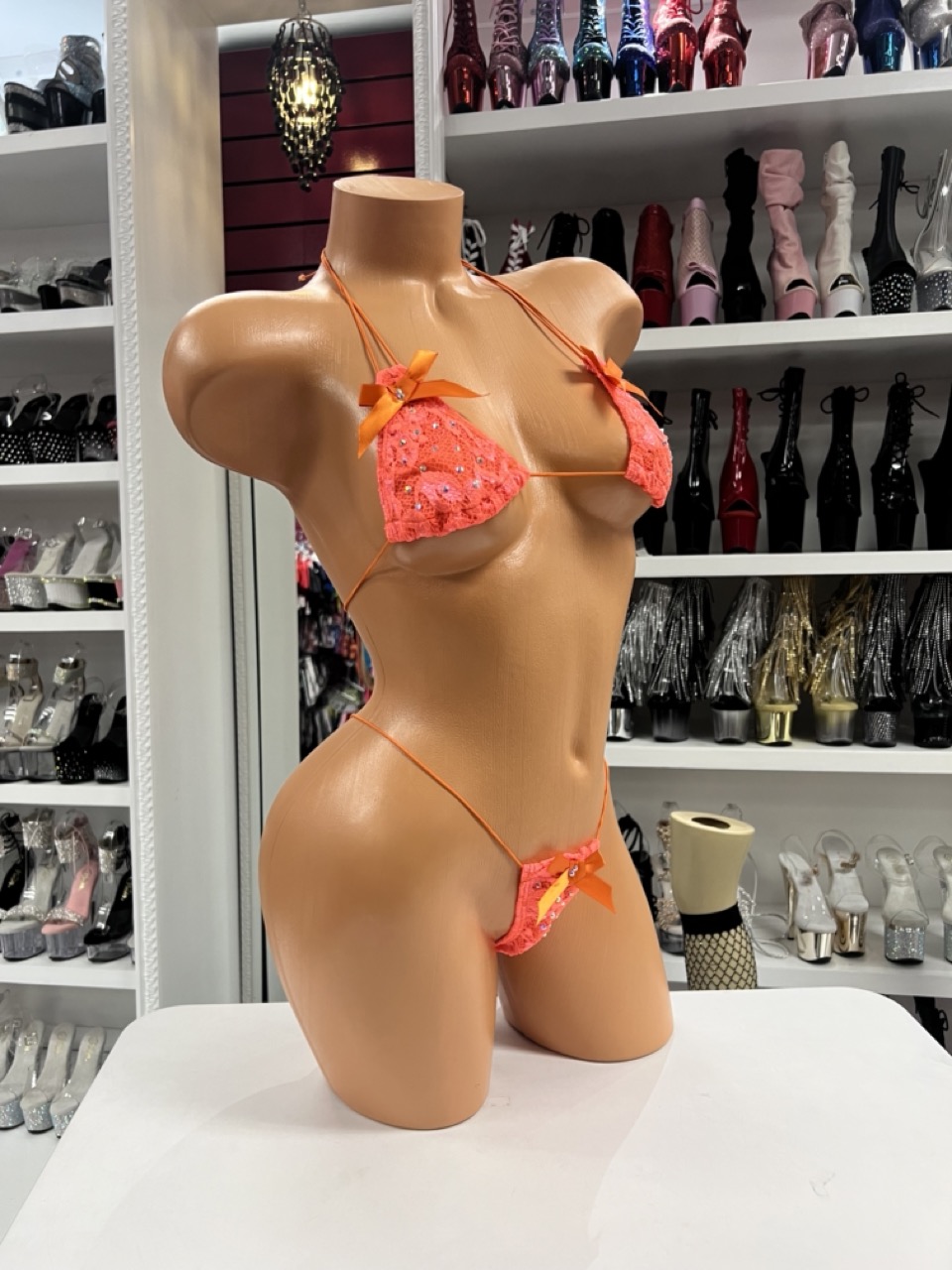 Orange Lace Micro Bikini delivers a bold color with delicate detail. This two piece set features a triangle top and matching thong with bow accents.