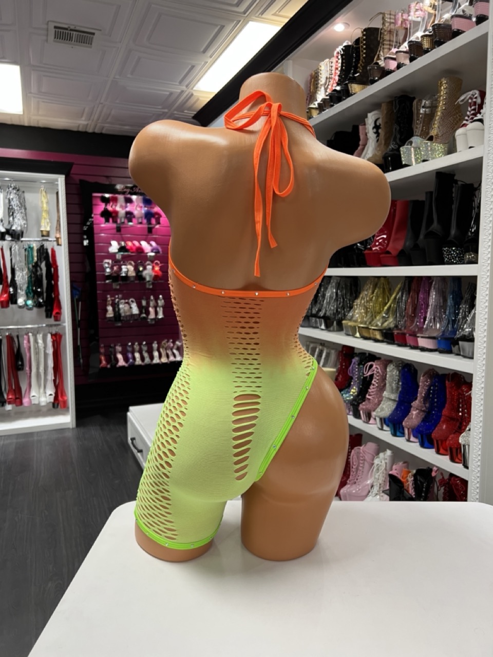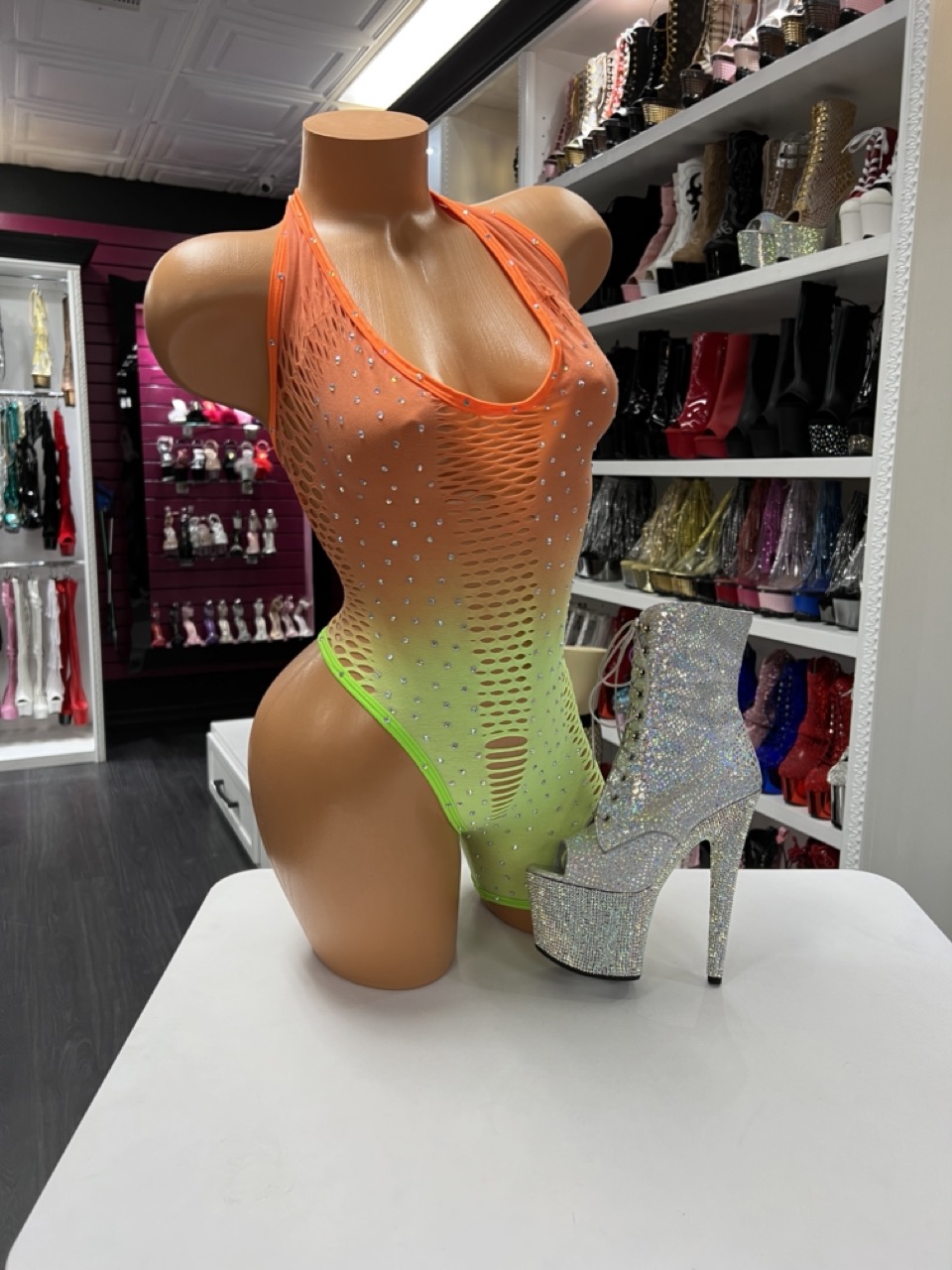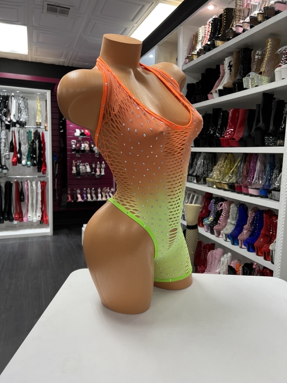 A neon ombré mesh bodysuit with rhinestone sparkle and a breathable, flexible fit. Bold, bright, and perfect for dancers who love high-shine color.