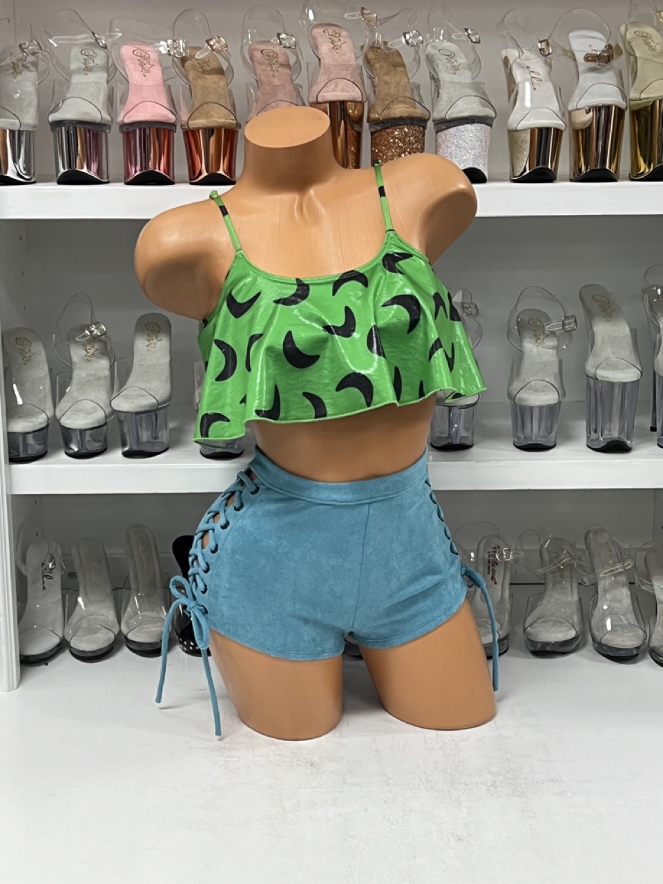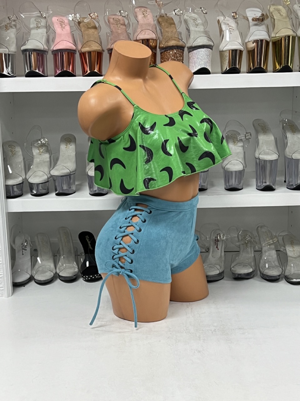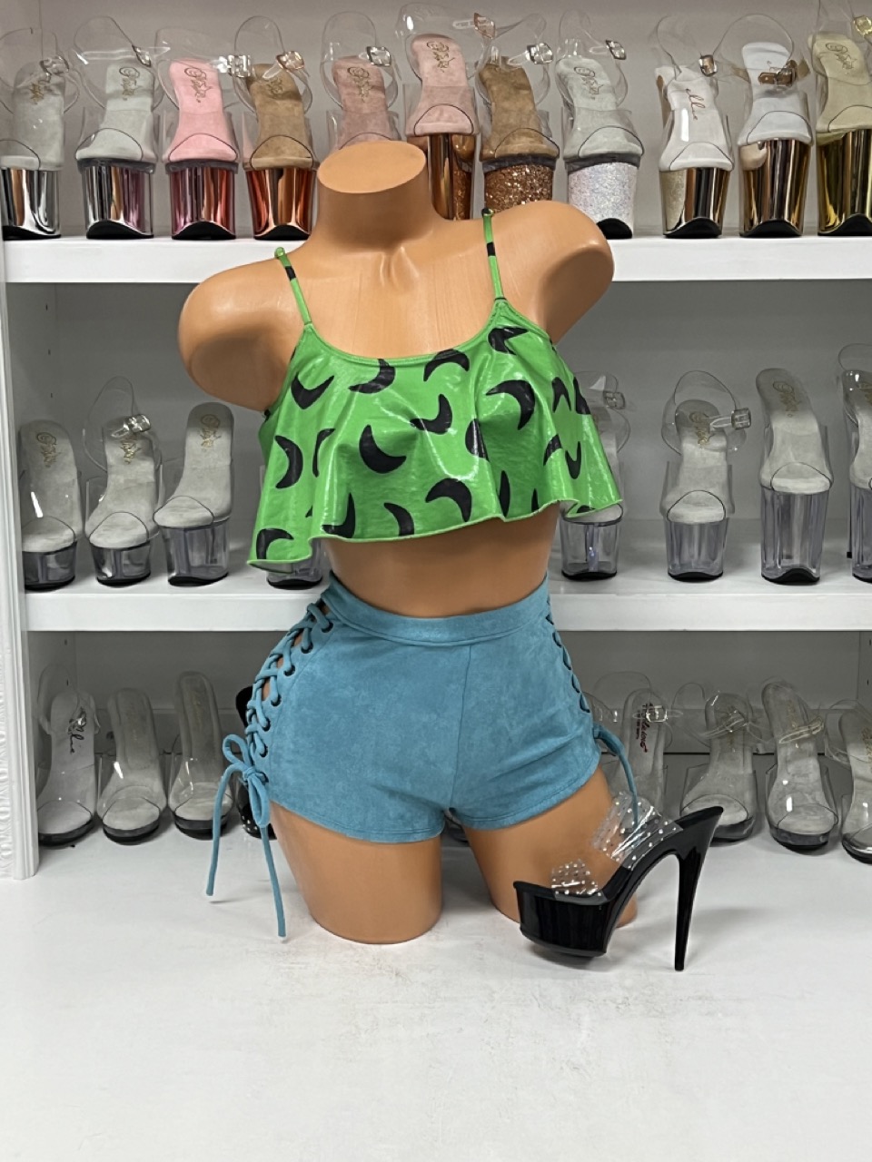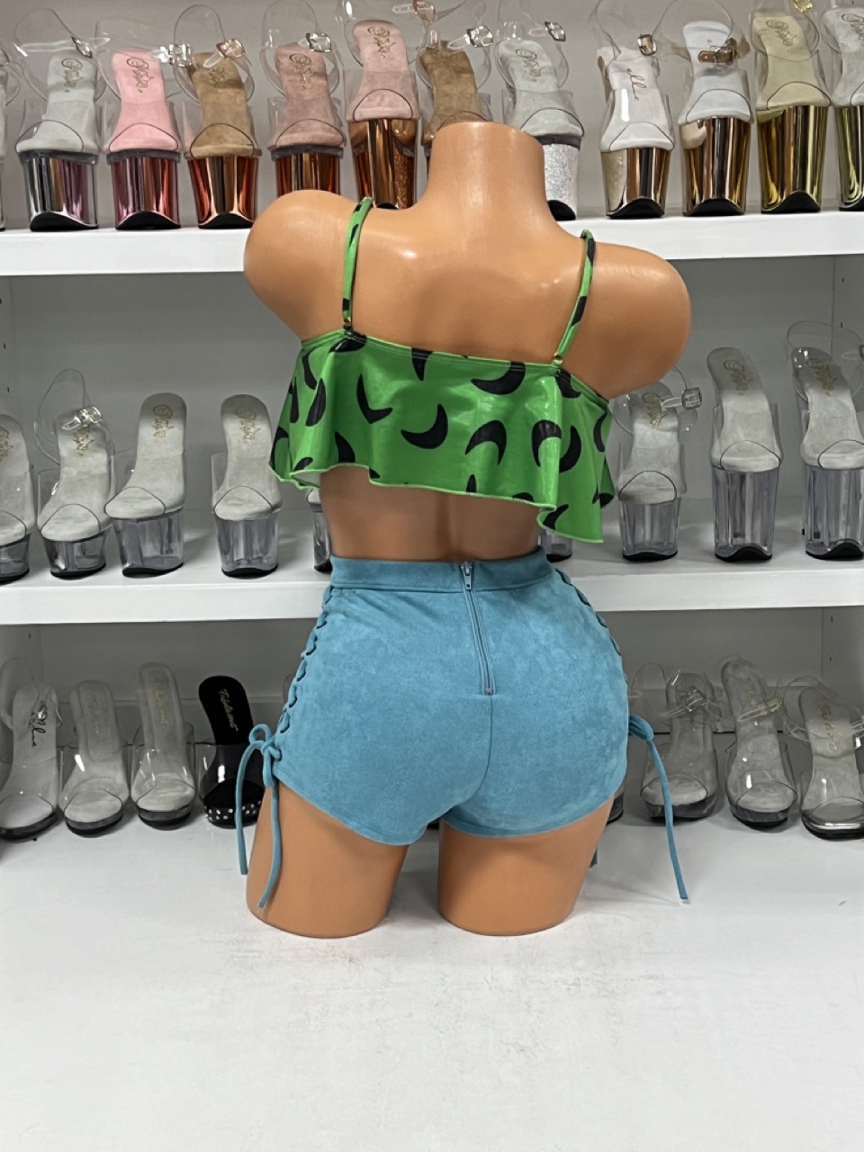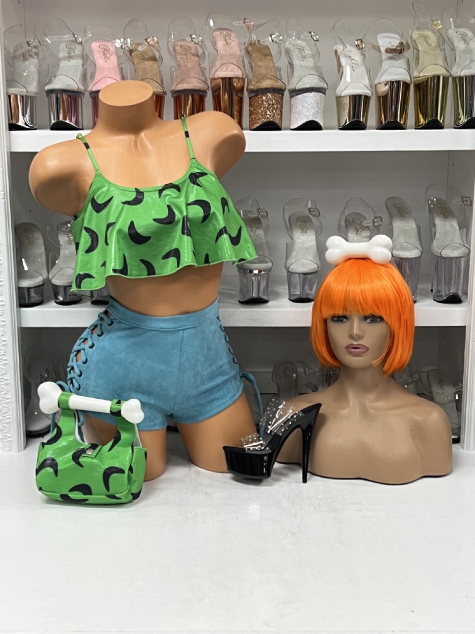 4-piece sexy cartoon character costume features metallic foil half moon print flounce crop top paired with faux suede lace-up tie-side shorts paired with bone hair accessory and bag. No returns or exchanges.