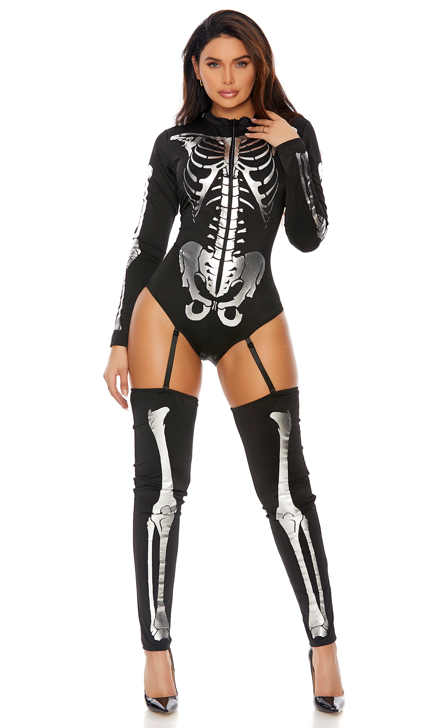 Show people what your sexy insides look like this Halloween with our 2 pc Pick A Bone Sexy Skeleton Costume. The zip front bodysuit with metallic bone screen print comes with garters and is paired with thigh-high leg accessories. No returns or exchanges.