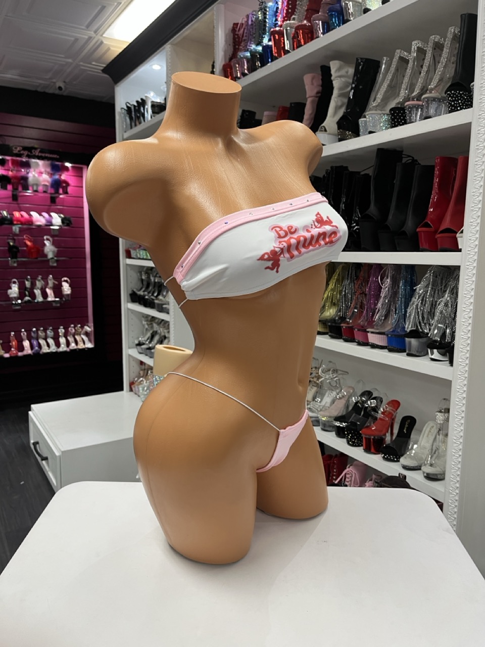 A playful white and pink micro bikini featuring a “Be Mine” graphic and rhinestone accents. Perfect for themed performances and flirty looks.