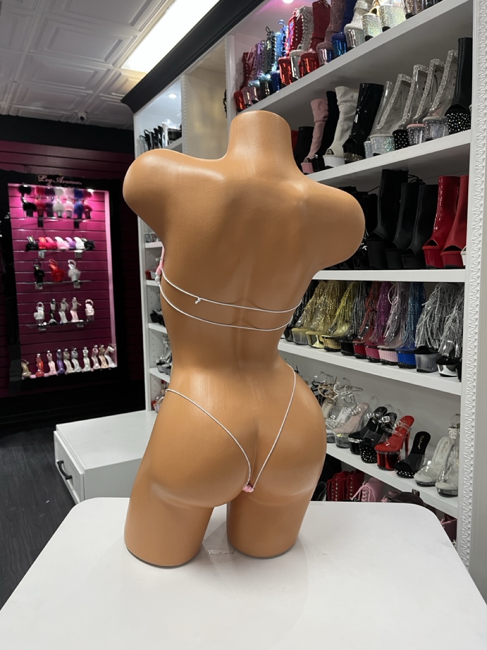 Pink be mine bikini with white bandeau top and pink micro bottoms