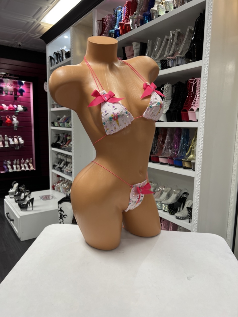 Pink bow micro bikini with rhinestone detail and playful design. Cute, flirty, and made for a standout look.